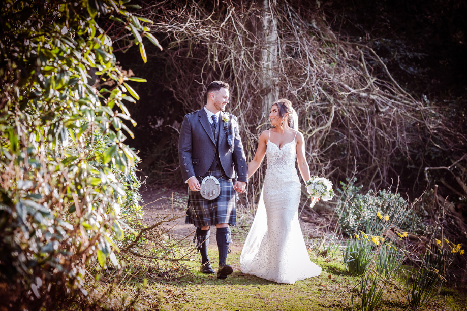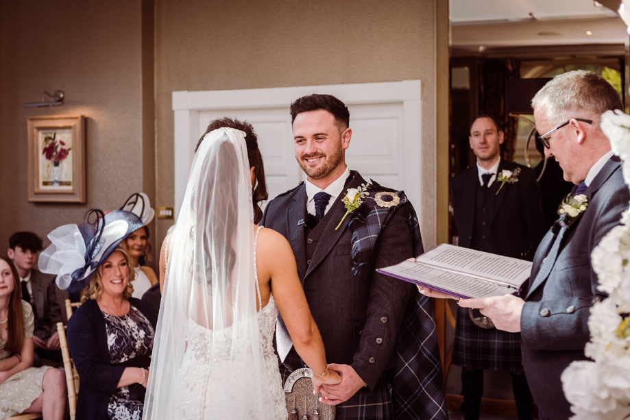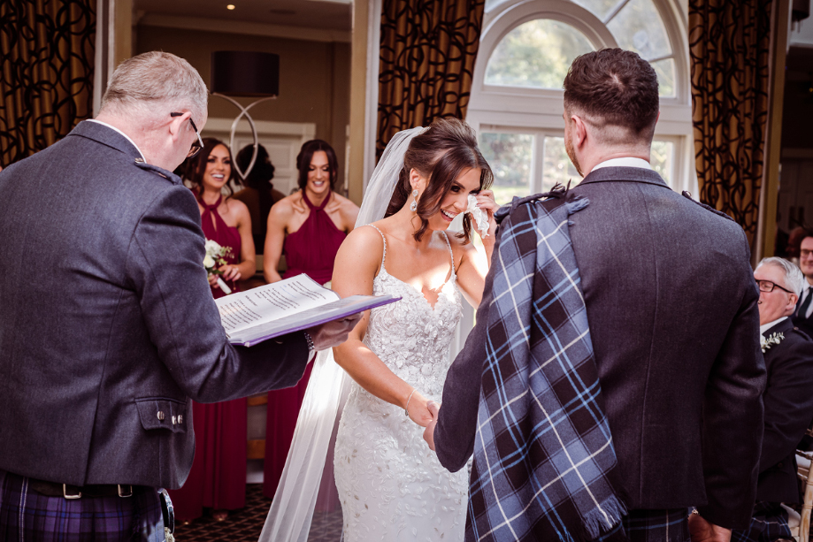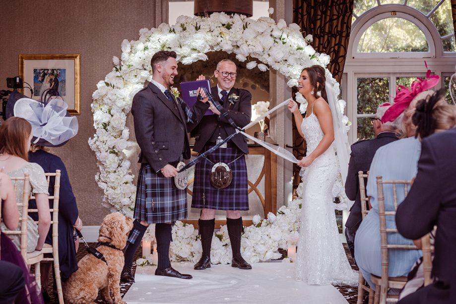 Gordon Bond from Independent Humanist Ceremonies was our celebrant. He hit that sweet spot between professional and humourous admirably. We wanted to include some Scottish rituals, so we got a quaich engraved from which we drank a blend of whiskies. We also ‘tied the knot’ in a handfasting using a cut-off from my wedding dress and the tartan Stuart was wearing.