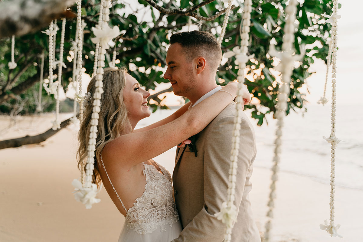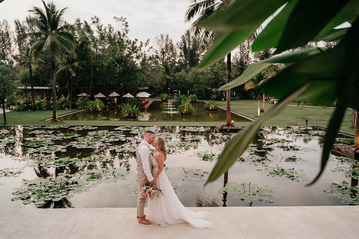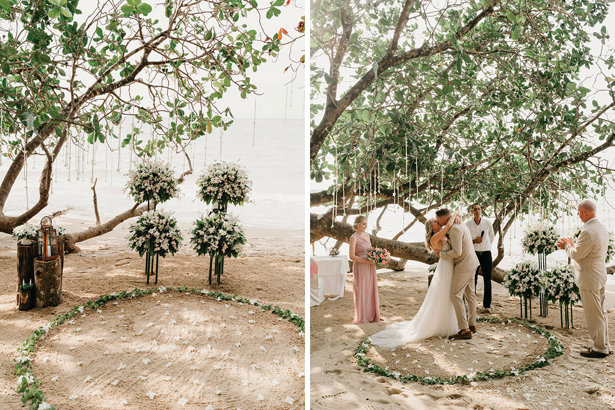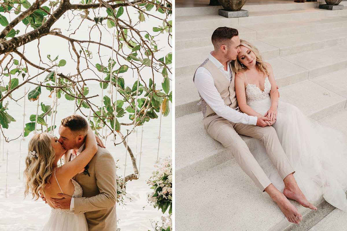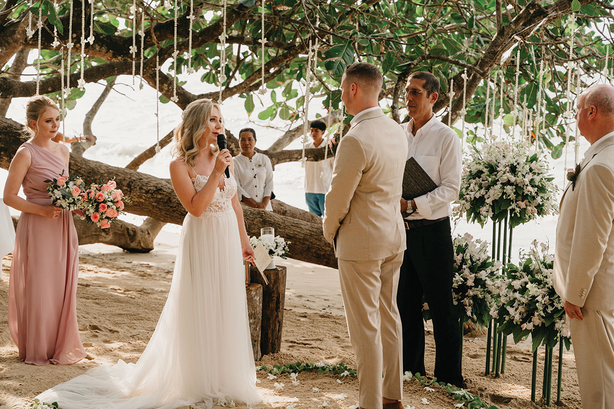 Thailand is a special place for us (we’ve visited lots), so we knew we wanted to get married there. As soon as we saw The Sarojin we knew it was the place for us. It’s absolutely stunning. The ceremony was on a white, sandy beach under a ‘wedding tree’ that was decorated with lots of hanging flowers. It had a serene, tropical feel.