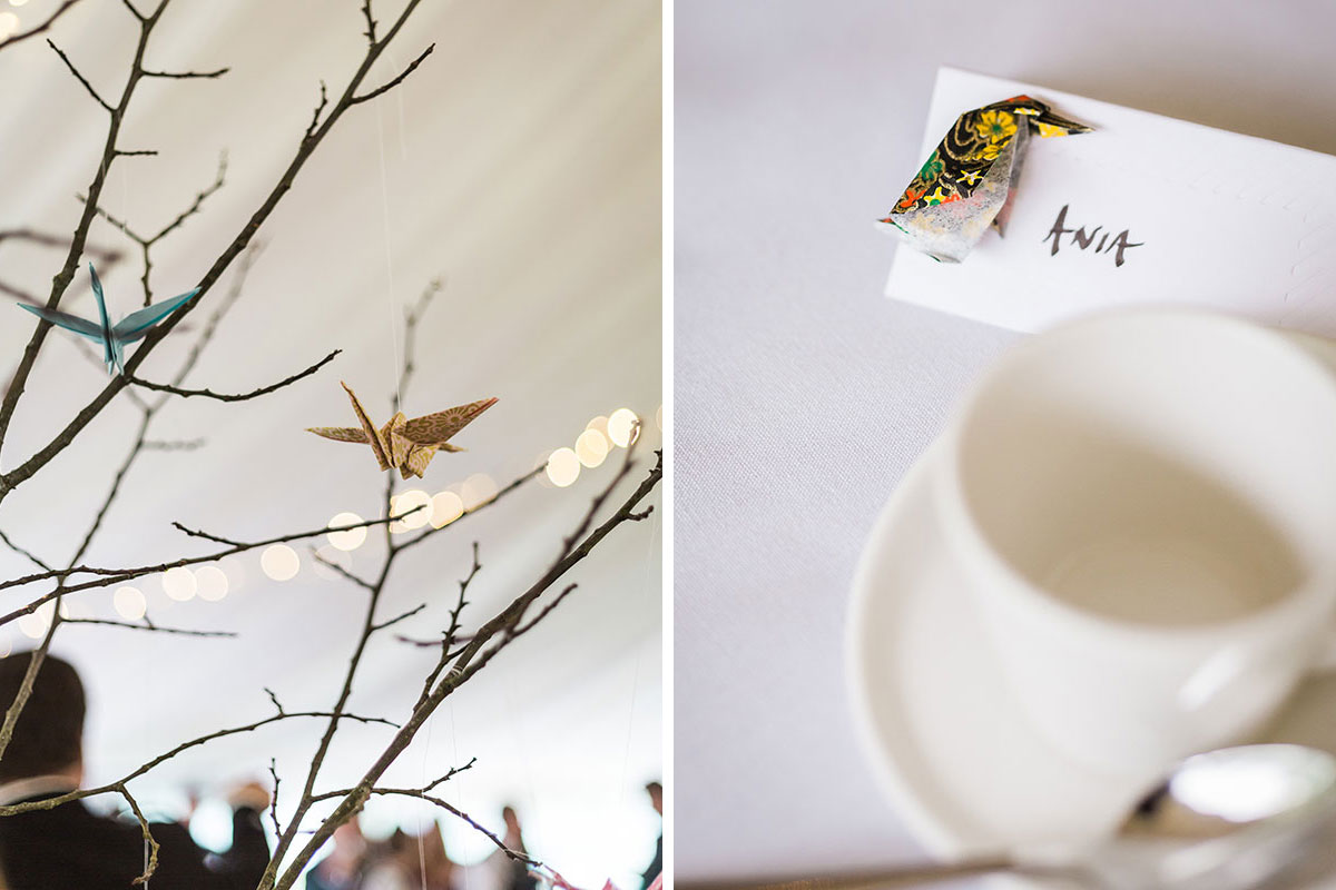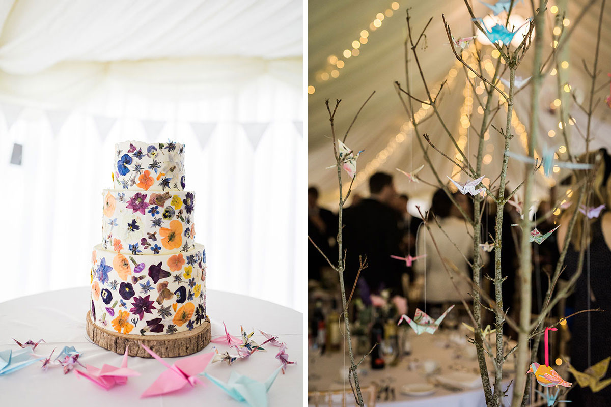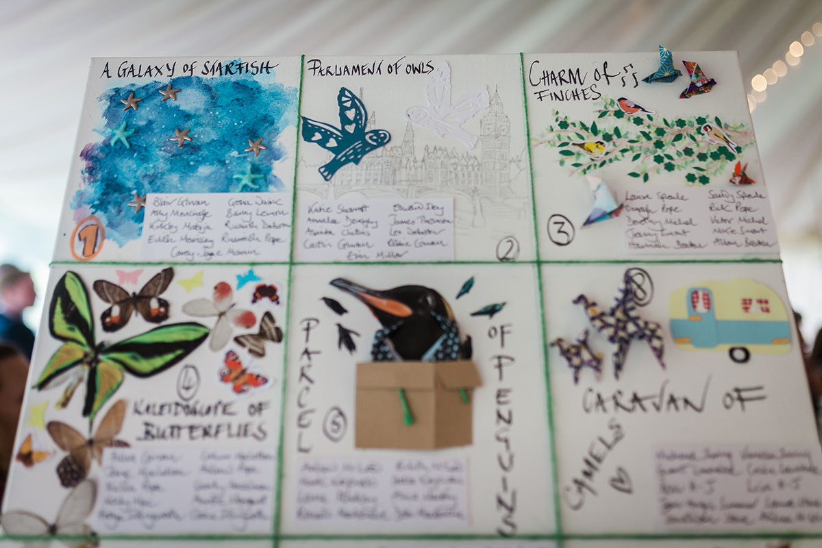 Afterwards, us and our 130 guests walked to the walled garden where we had the reception in a marquee. It was a total team effort decorating the marquee. We had a lot of pink peonies, daisies and bunting made by my friend Ruth at Bruar Kelpies. I created all the signage – table plan, directions, place names etc – and printed a load of photos to dot about for decorations. We got some silver birch trees and hung lots of little origami birds from the branches that my bridesmaids spent ages making.