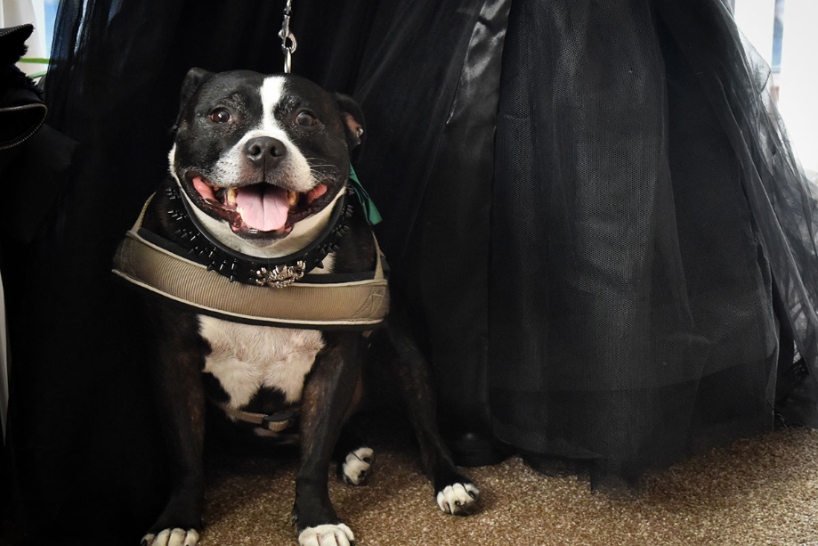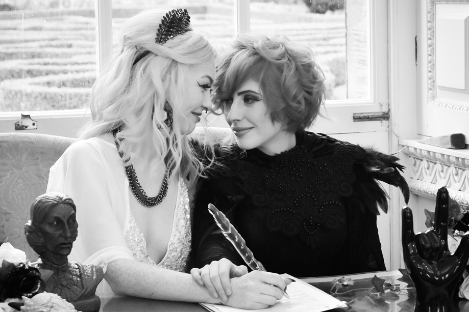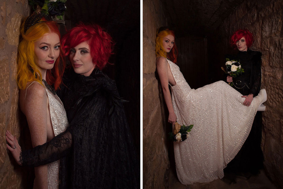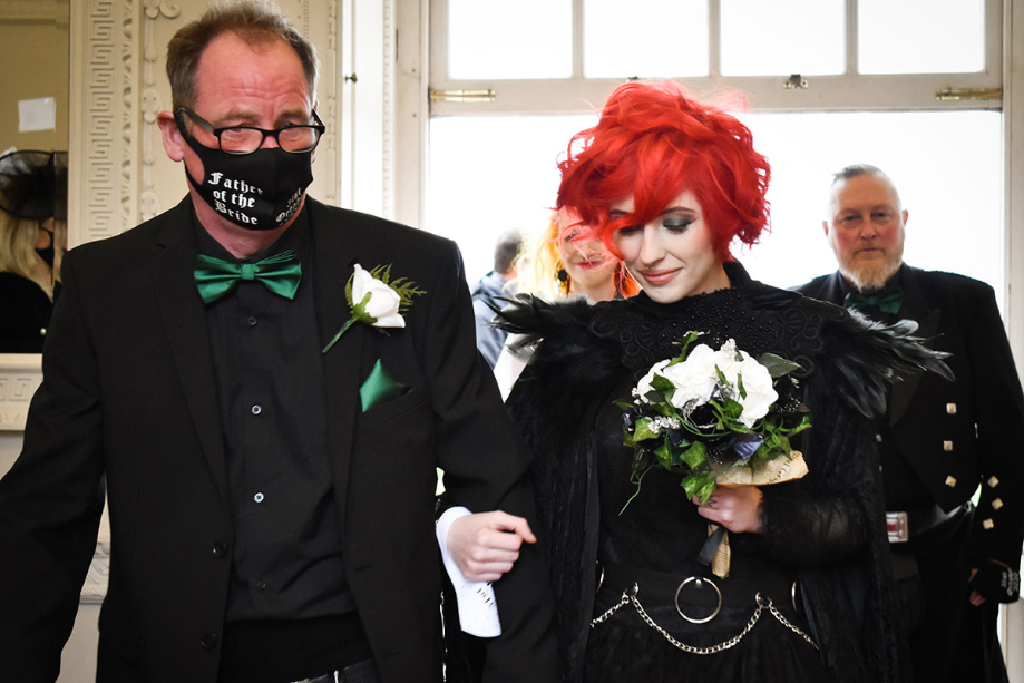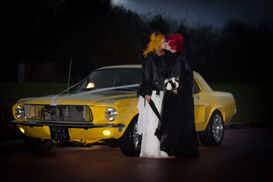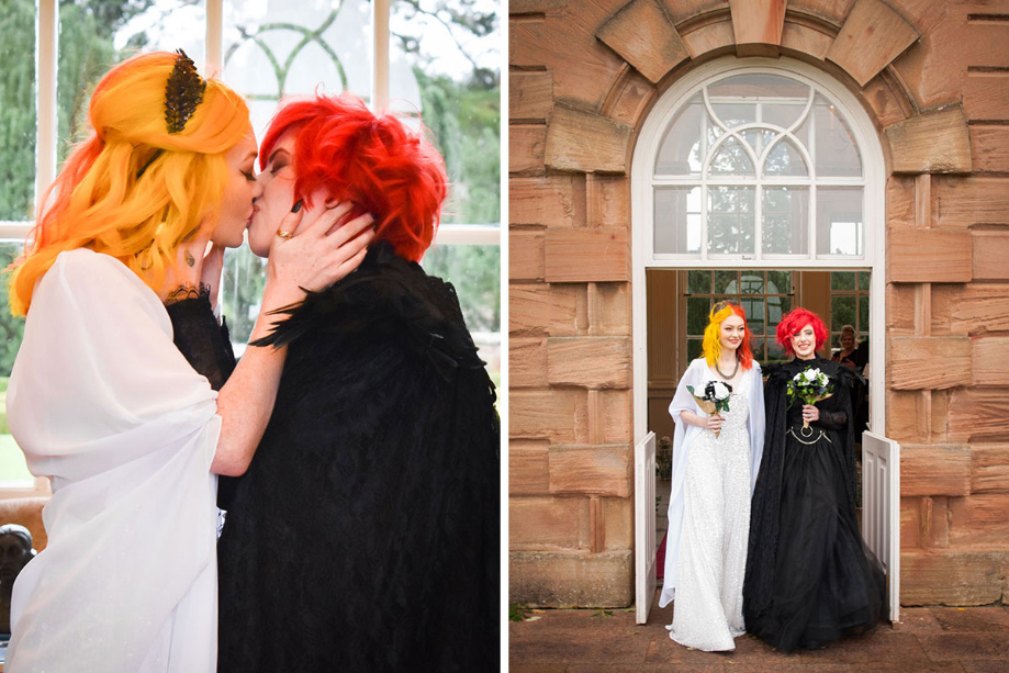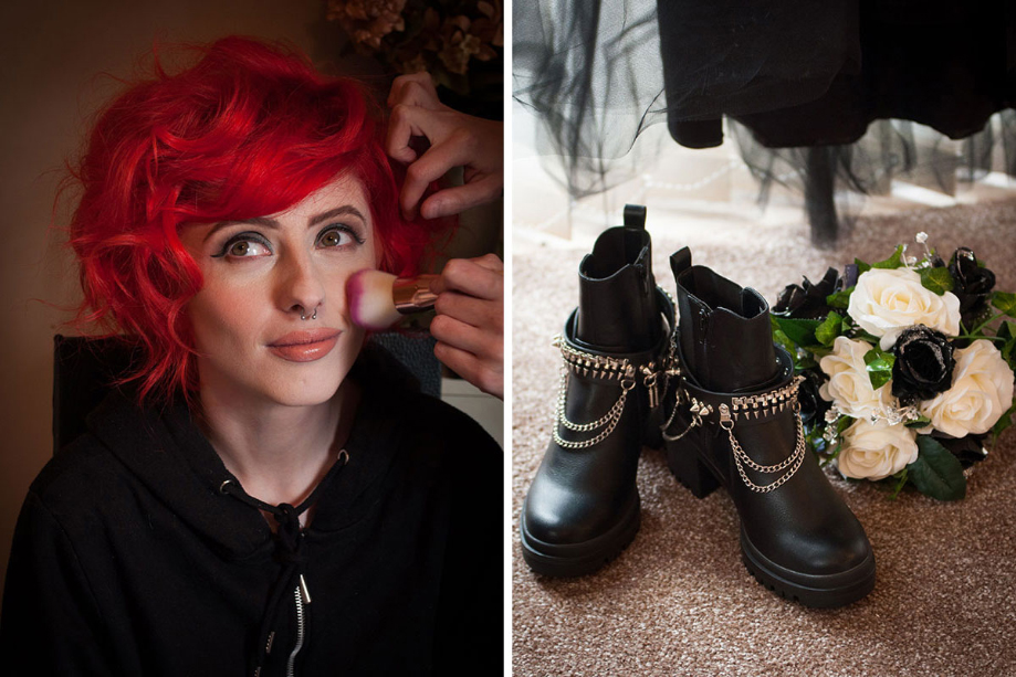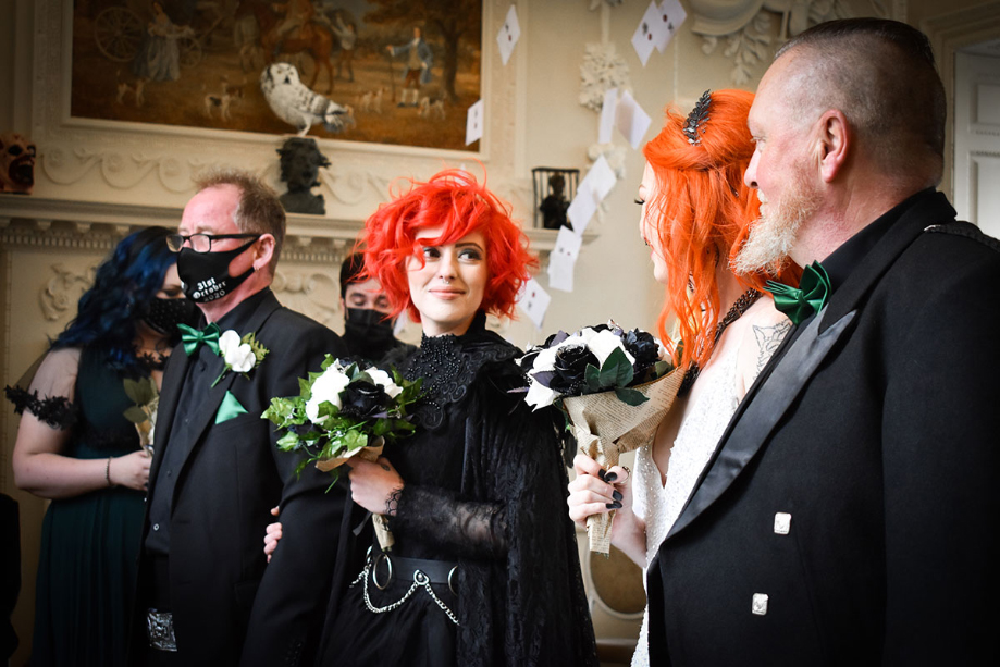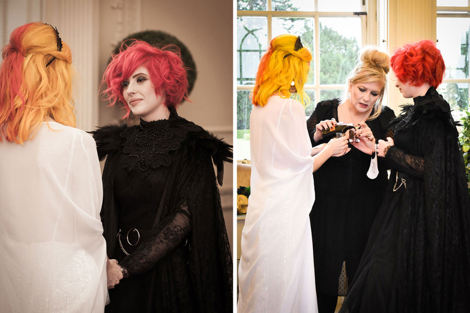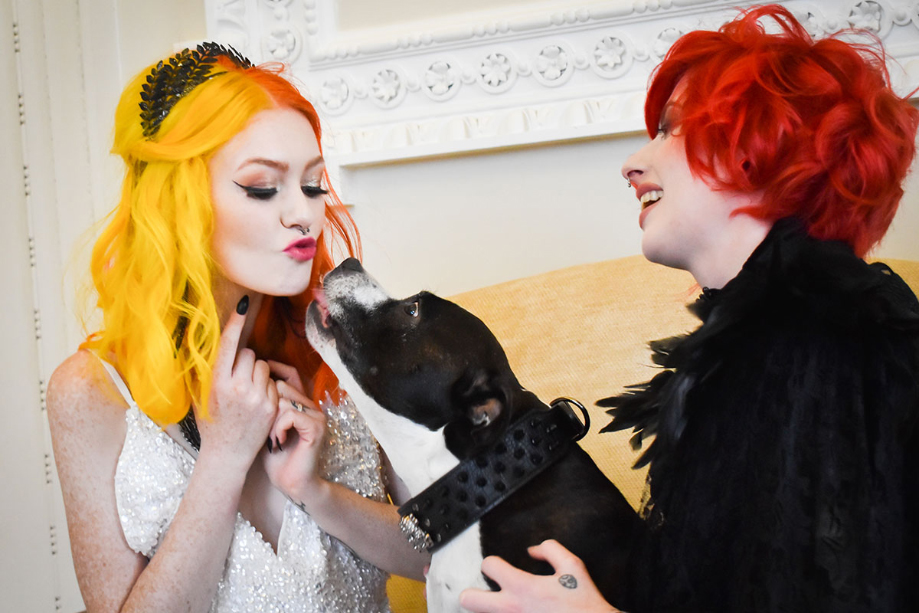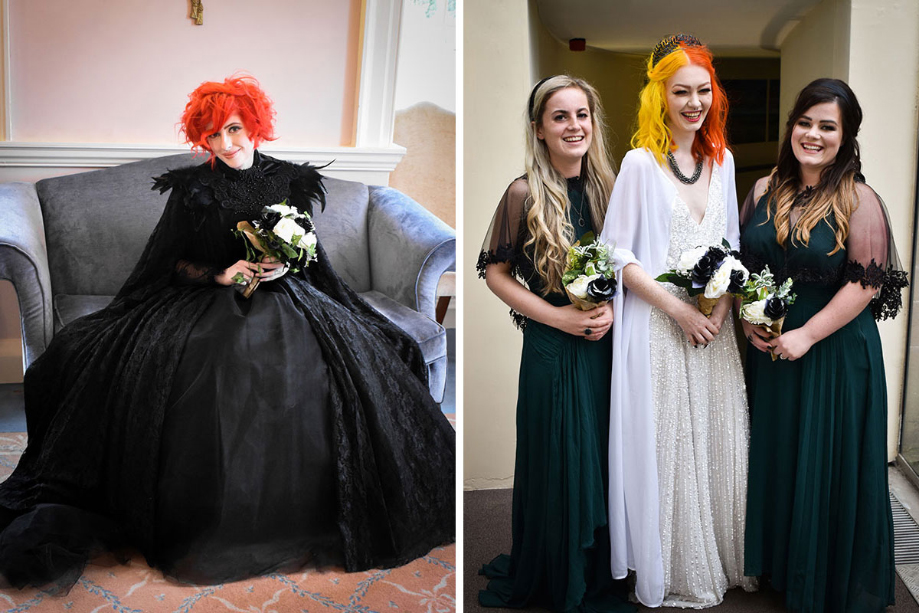 We’d always wanted an alternative wedding so getting married on Halloween meant we could really go to town with the details. I wore dark, dramatic jewellery with my Grecian ASOS wedding dress, while Shannon wore a gothic rock ‘n’ roll-style dress, complete with black raven-feathered cape. The rest of the bridal party wore black too.