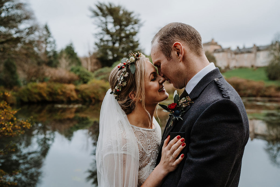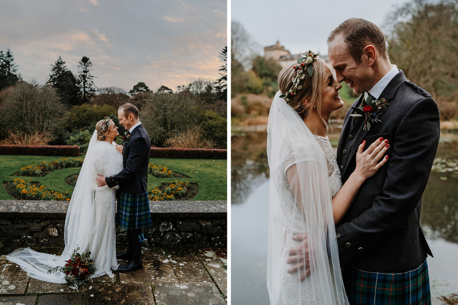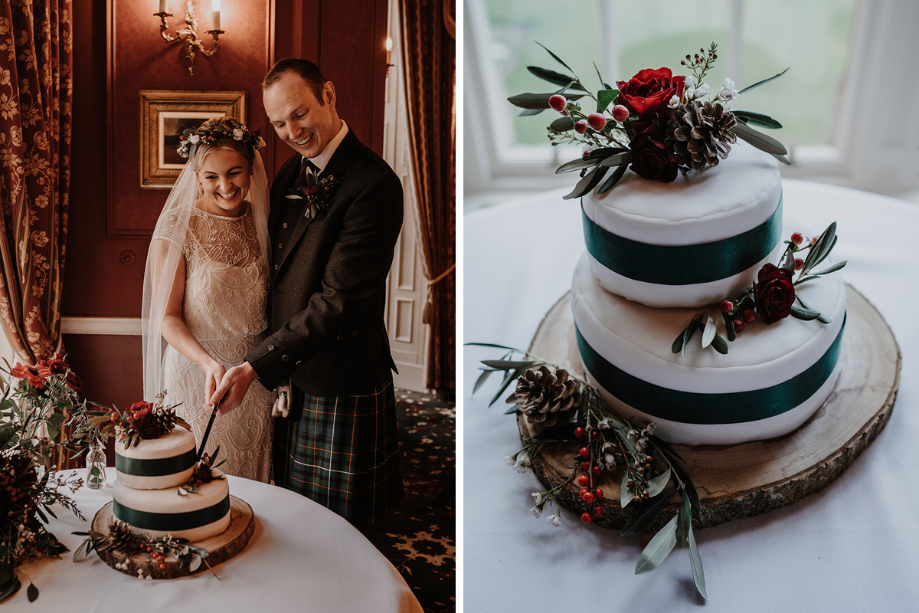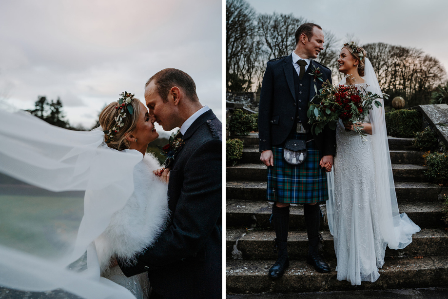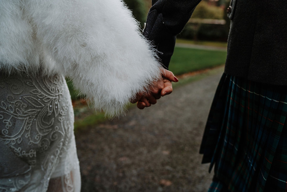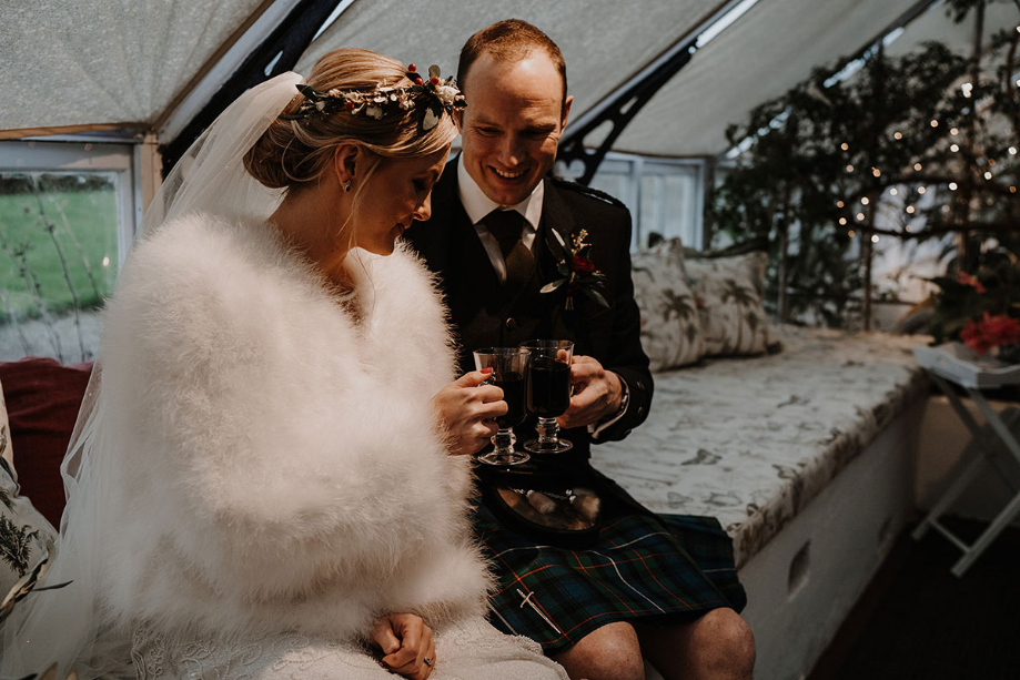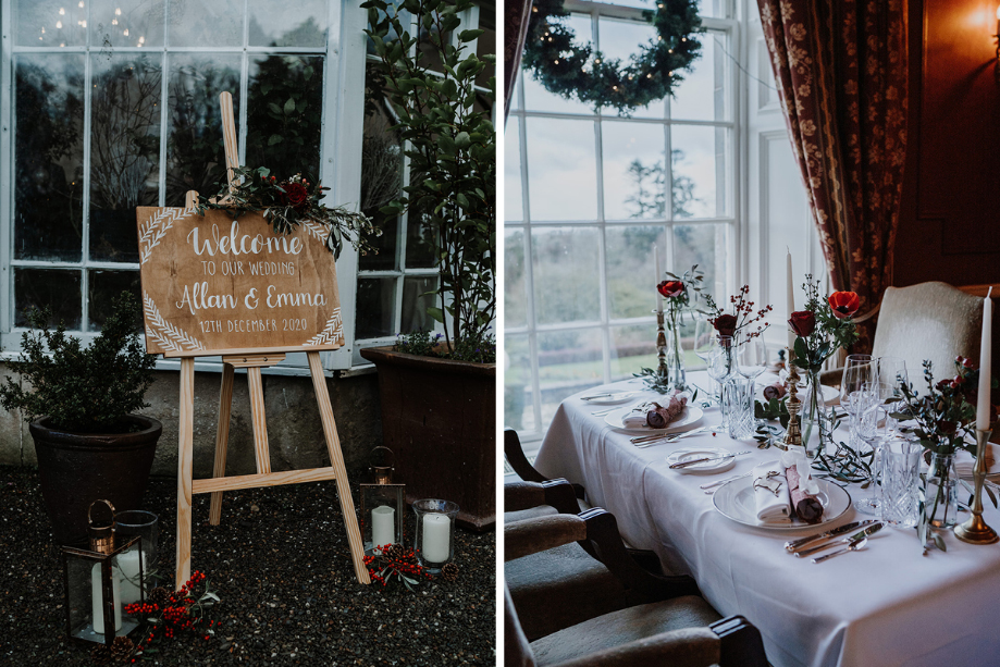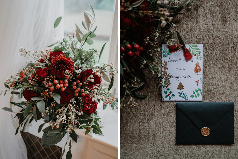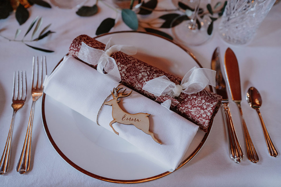 Marrying in December, we couldn’t resist having some festive touches. We had little reindeer place settings; served mulled wine after the ceremony; then cosied around one of the castle’s open fires with champagne. I also found a fun ostrich-feather jacket online to keep the chill at bay while getting pictures taken outdoors.