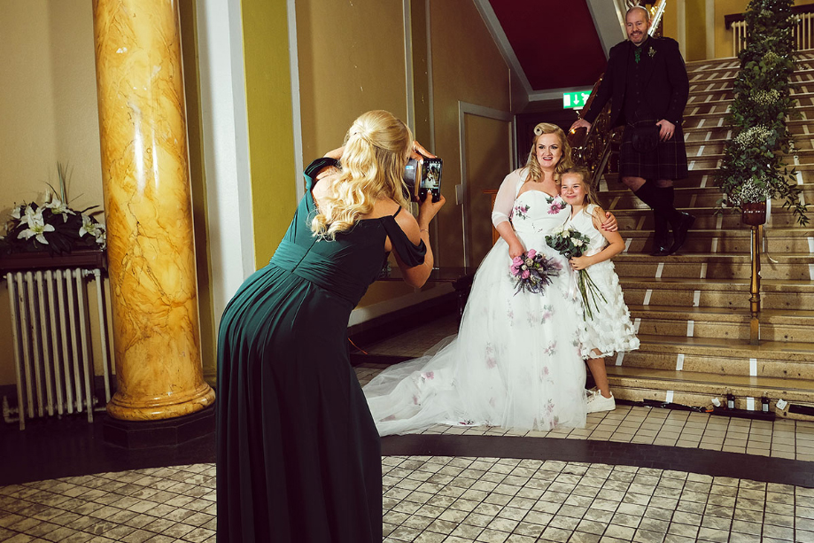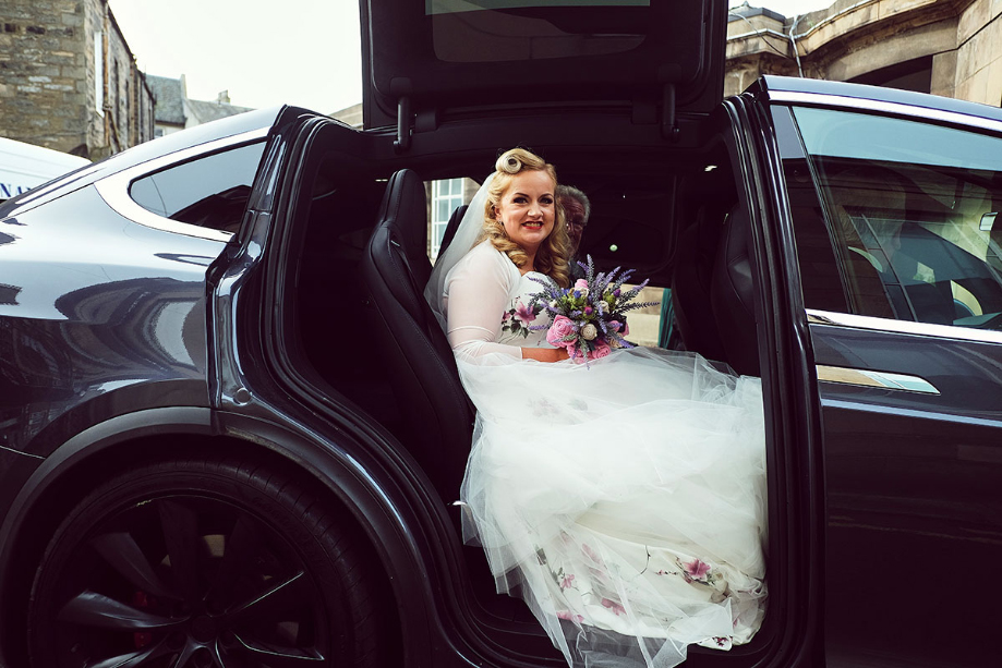 As we live close by, myself and the bridesmaids thought it would be nice to walk to Leith Theatre. The forecast wasn’t looking great, though, so I decided a few days ahead that we’d get taxis. I work as a paediatric oncology nurse and parents of a young patient of mine heard about my plans. They own a taxi firm in Edinburgh and kindly said they’d sort it out. I was touched by this gesture, but hadn’t expected them to donate their own fancy Tesla cars for the occasion! It was such an emotional moment when Zoë, the mum, turned up on the day to drive me.