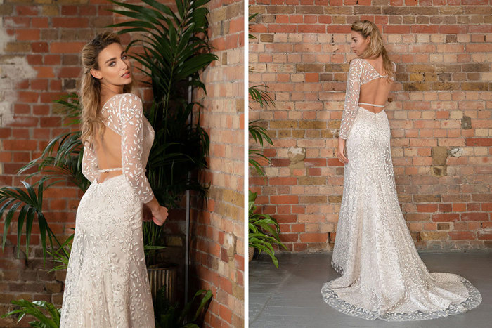 First up, the namesake collection is designed with the traditional bride in mind. This collection is super glamorous with a sassy edge, boasting clean lines created with sumptuous satin and rich, elegant lace.