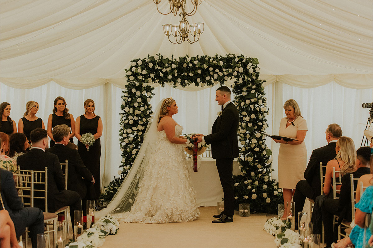 Kim and Ross tied the knot at the Lanarkshire venue with luxe decor, a chilled out wedding morning and a portable prosecco bar