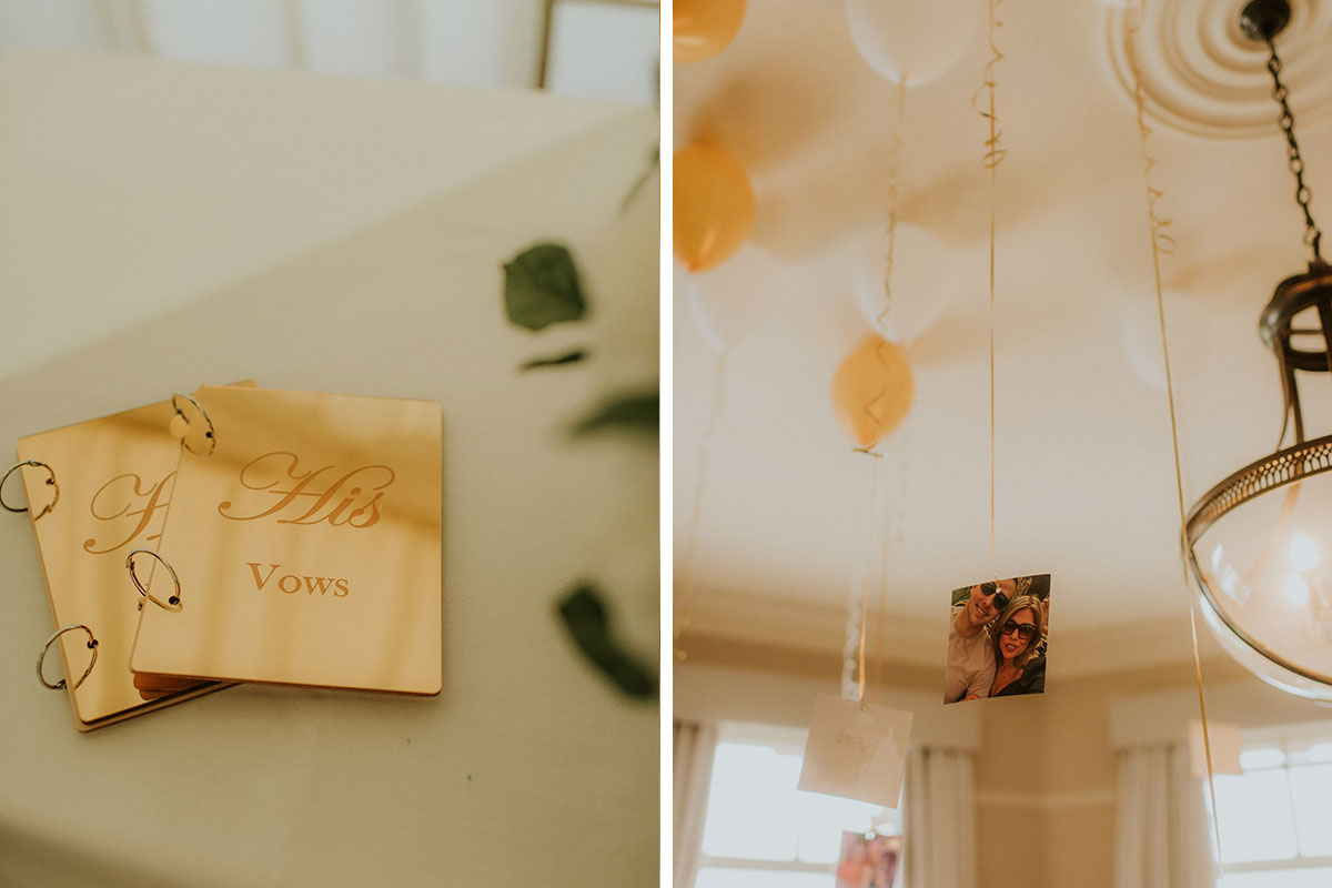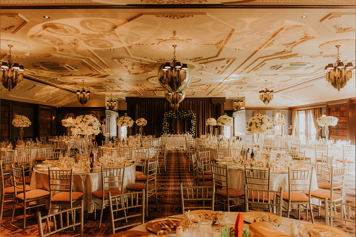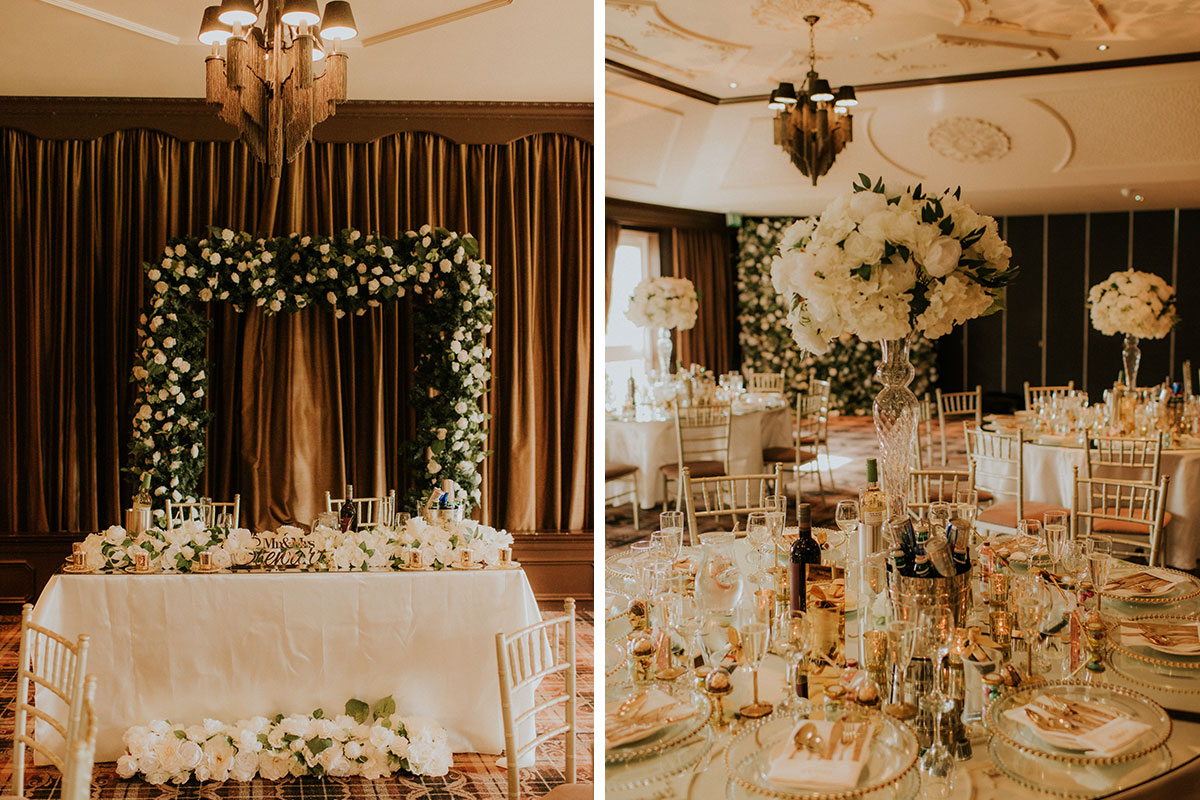Like many brides, I had a Pinterest board with many ideas and this evolved over time. I recommend not rushing into any themes right away. Once we booked the venue we took stock of the colours and Cornhill has a beautiful gold ballroom and lovely gold Chiavari chairs. We went for golds and gold acrylic for our wedding invites and all stationery and greens and whites for the flowers.