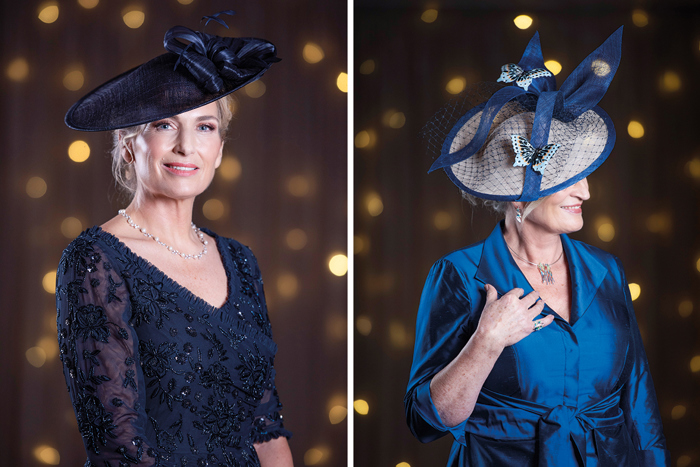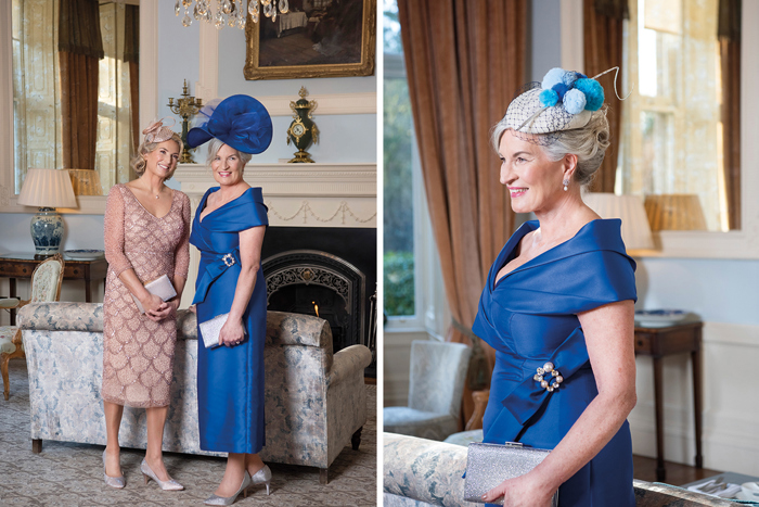 Sharon (on right) wears: Midi cobalt-blue dress with beaded bow brooch detail at waist by Gabriela Sanchez, £POA, large cobalt-blue fascinator, £POA, and silver diamanté clutch bag and shoes, from a selection, all Frox of Falkirk. Floral earrings, £55, Lido Collection.