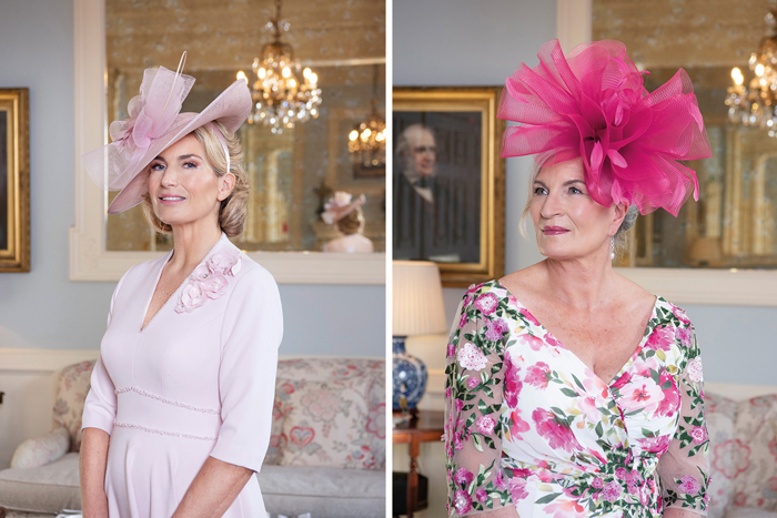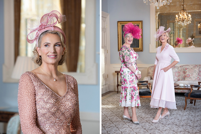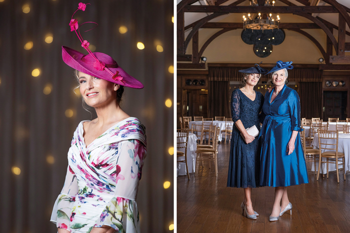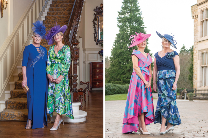 Sharon (on right) wears: Crepe and organza fitted dress, £659, and matching hatinator, £285, both Bentleys. Wild Grasses cubic zirconia bracelet, £296, and Wild Grasses drop earrings, £101, both Sheila Fleet. Shoes, model’s own, all as before.