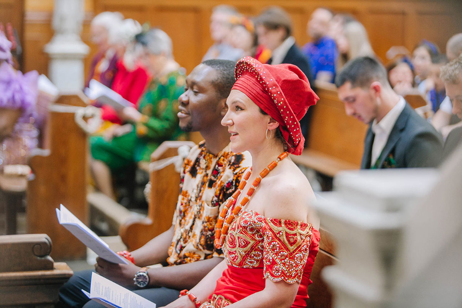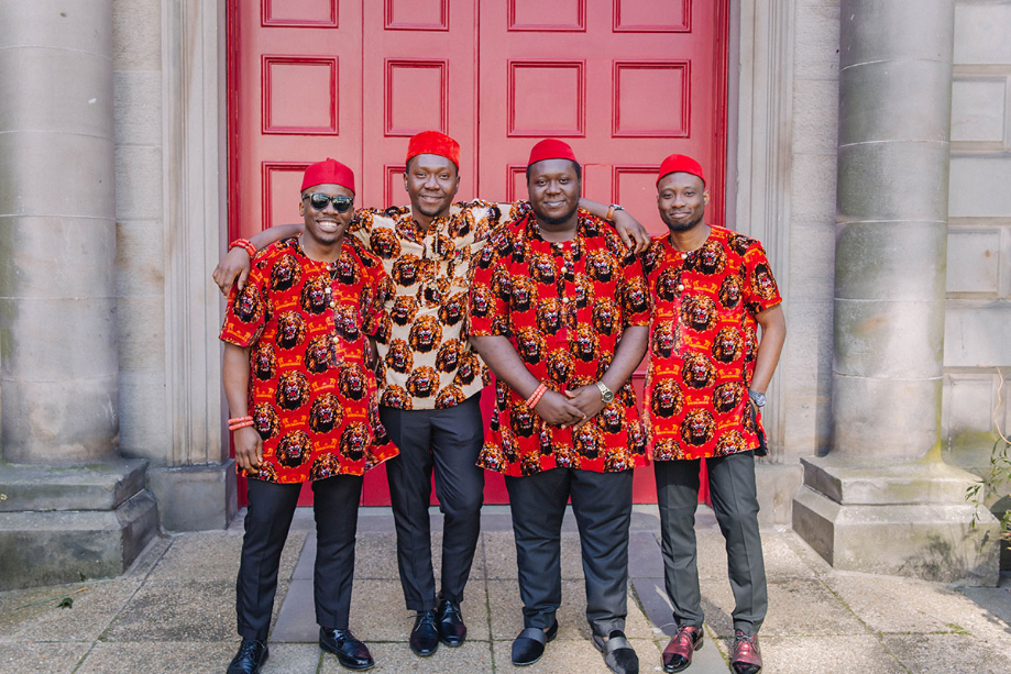 Before the wedding, we sent out Igbo fabric to our guests. Everyone got creative with their sewing machines making wonderful, colourful outfits. I wore a typical Igbo bride outfit: a red Judge wrapper gown. We had alternating outfits: I matched the groomsmen, while Ebuka wore cream to tie-in with the bridesmaids.