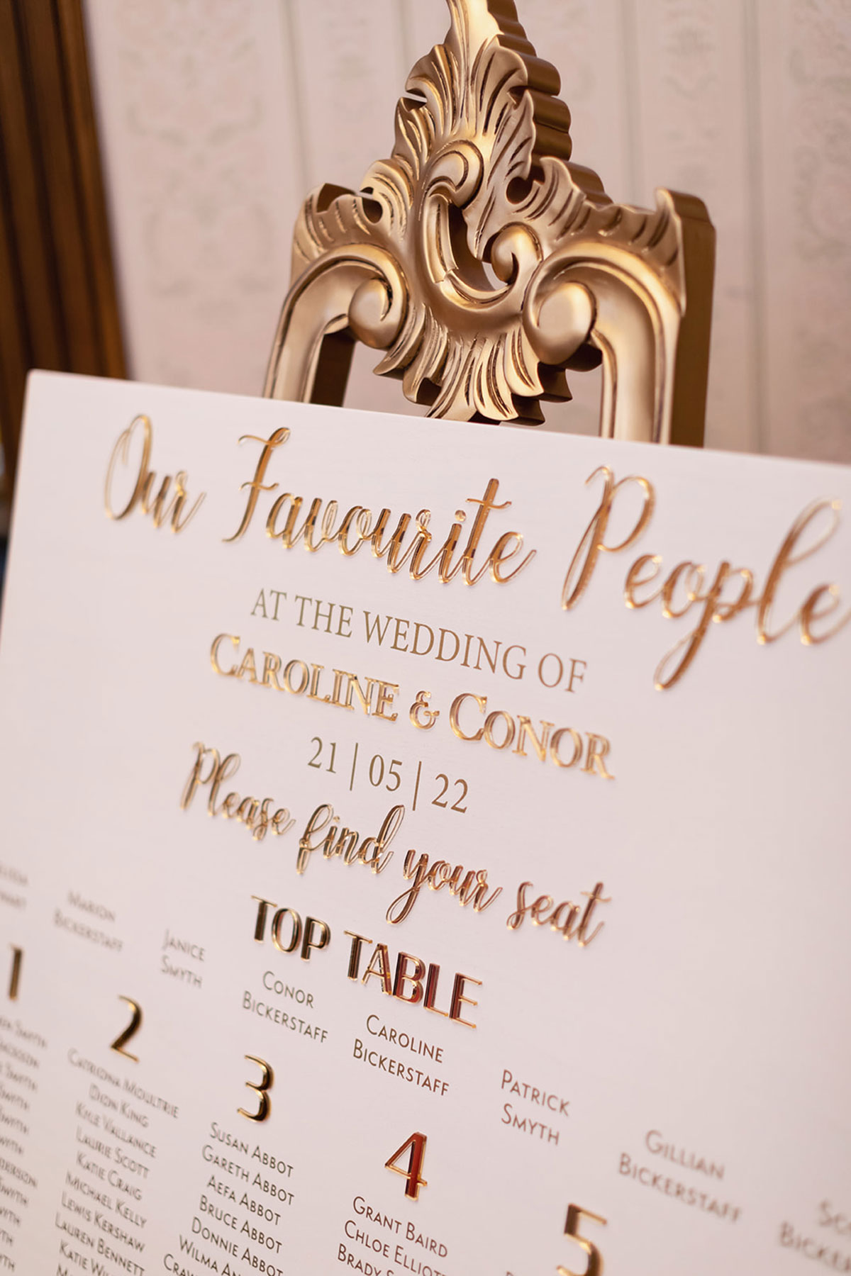 Caroline loves a touch of gold – used here, it really makes this seating chart stand out (Photo: Craig & Eva Sanders Photography)