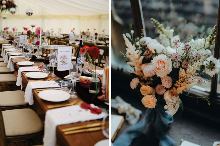 Left: (photo: madhouseweddings.com) “The maximalism of the 1970s is one of my favourite throwbacks,” Emma Mallen of Duchess Seerra reveals. From velvets to tassels, reds to mustards, Mallen has been creating fun-filled, retro decor schemes that might even have a few disco balls thrown in for good measure. Right: (photo: fdyoungphotography.com) Finding herself stepping back in time again, Emma of Duchess Seerra has been filtering the soft pastel hues of the 1940s-’50s, from table linens through to flowers. “These tones really add a romantic, whimsical touch,” she notes.