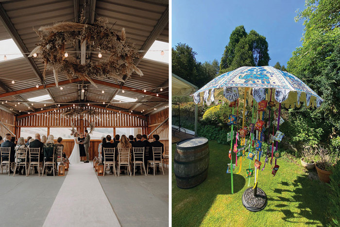 Left: (photo: delandjayjayweddingphotography.com) According to Katie Hart of Get Knotted, more and more couples are looking to be environmentally mindful as they dress their venues. Here, dried flowers are a win-win. Not only do they perfectly accompany a wide variety of colour schemes, they’ll continue to look good for years to come – making them a long-lasting keepsake. Right: Snacklovers, gather round and behold the beauty that is Get Knotted’s iconic spin on the classic crisp wall – the crisp parasol! Katie says: “Quirky or personalised food or drink stations like this will endure in popularity.”