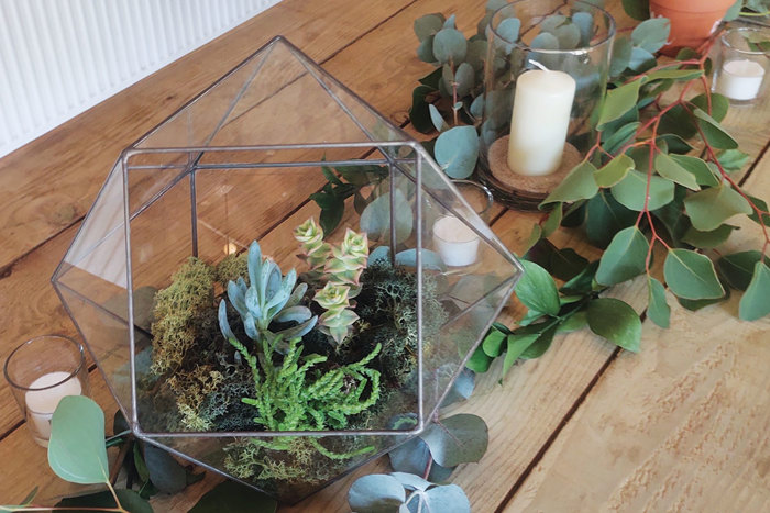 Katie has another eco-conscious example: living centrepieces. She believes that potted plants or flowers can really liven up table decor. Here she’s opted to complement the greenery with an assortment of candles and an eye-catching geometric terrarium planter.