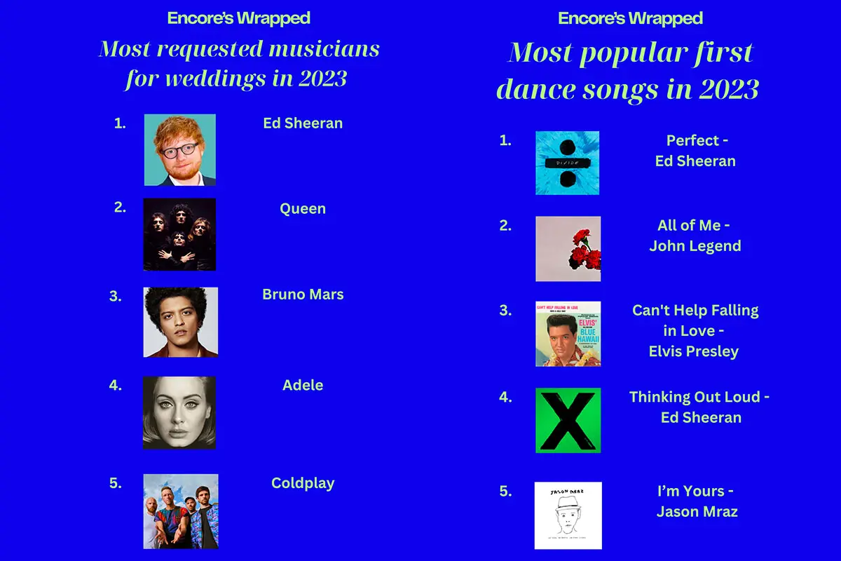 Most of us were keen to see what Spotify wrapped revealed about our listening throughout the year, and in a similar style, Encore Musicians has created their own ‘wrapped’ of the most popular first dance and wedding songs from 2023.