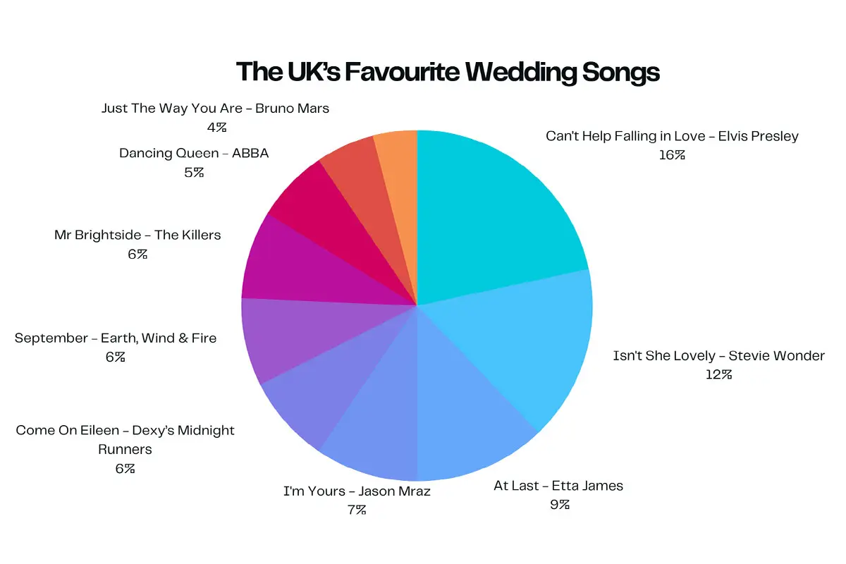 Ed Sheeran may be popular among couples, but when the wedding guests get a say, they vote for Elvis. The King of Rock and Roll’s romantic tune ‘Can’t Help Falling in Love’ was a winner among those surveyed, and we must admit, it’s a good choice.