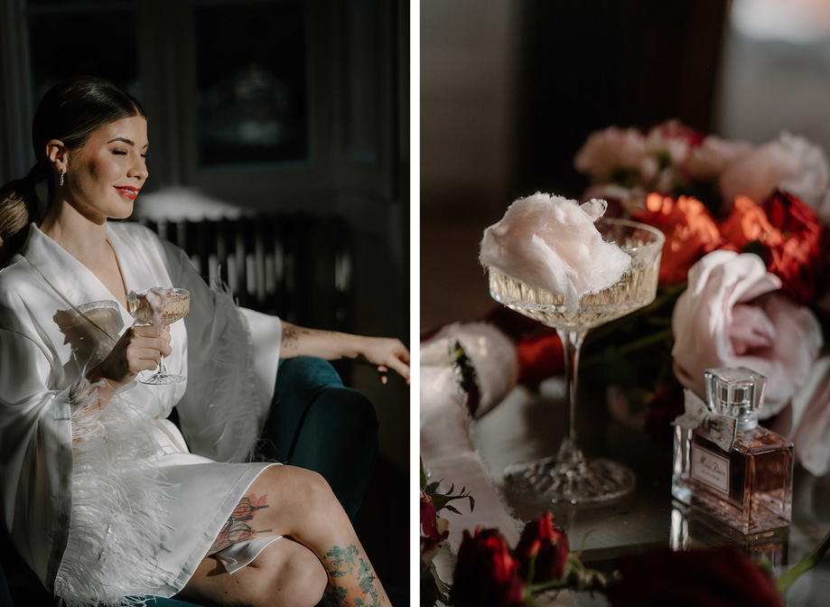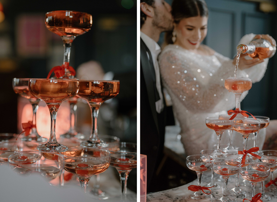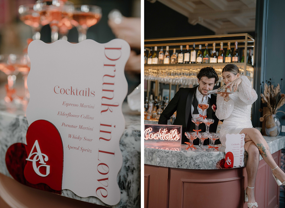 “The venue had the coolest backdrops and brought even more colour to the shoot,” recalls Lauren. “A standout moment was the champagne tower with pink fizz and cherries set up on the bar with the ‘Drunk in Love’ sign. The red love-heart confetti from Your Confetti is also a must-have for February couples.”
