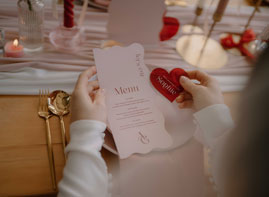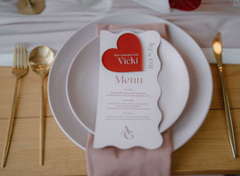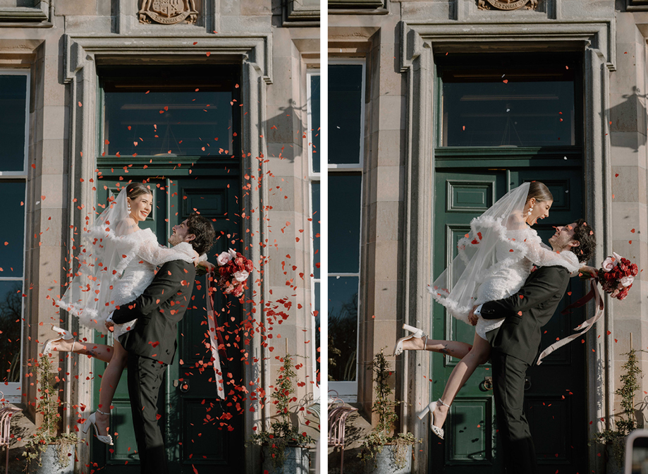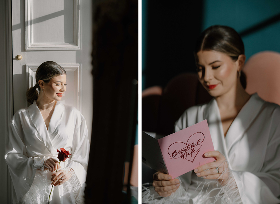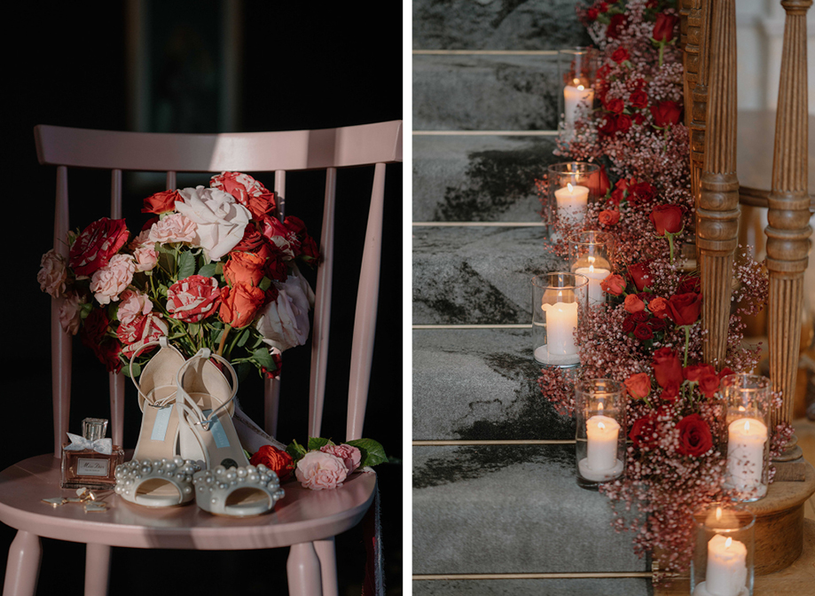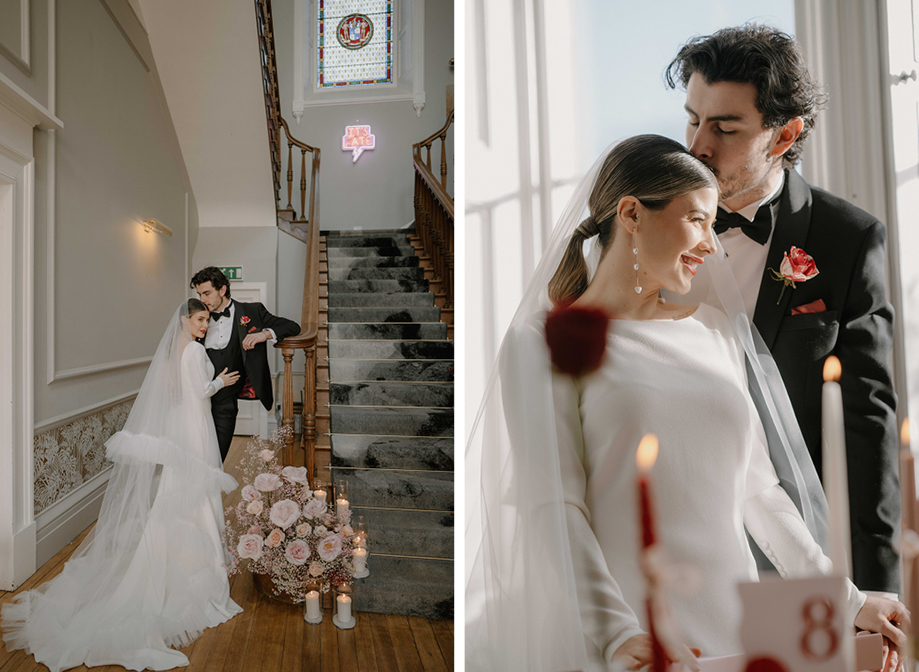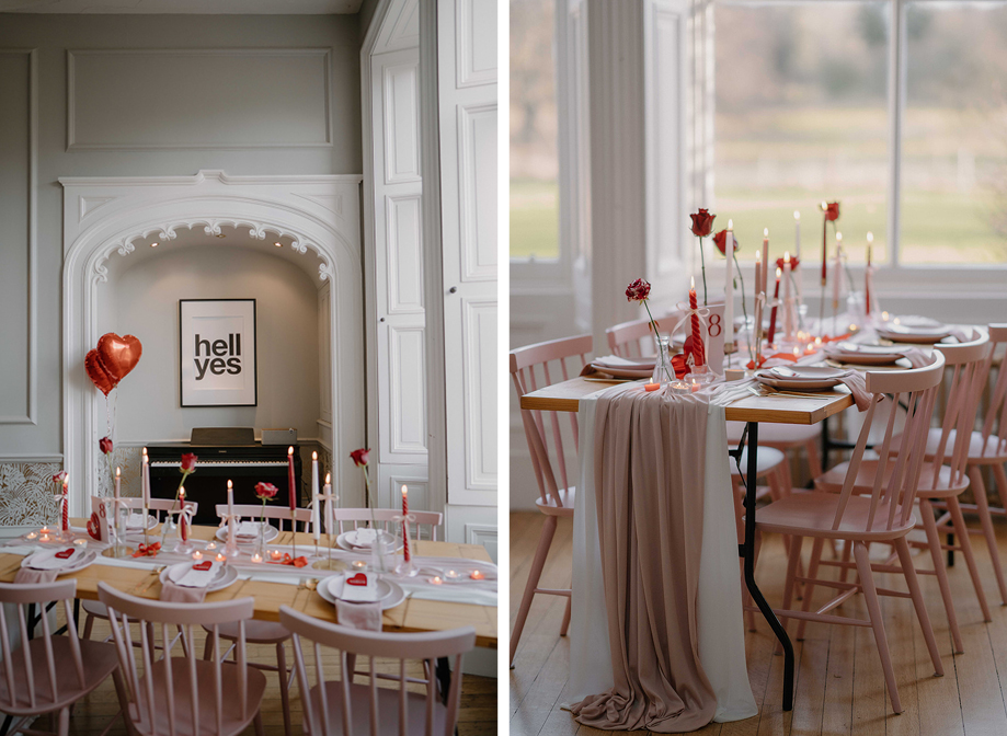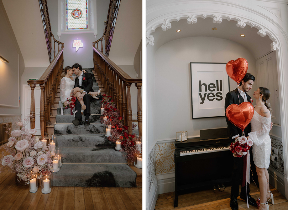 “The brief centred around vibrant red and pink colour blocking as these are the colours of love,” Lauren says. “Greenock florist Hey Bud created flowers in their signature modern, vibrant style and the bouquet featured deep red roses, marble roses and a touch of pink with adorning ribbons. When it came to the table setup, Edinburgh prop hire and wedding stylist Little Dressing Co. styled it beautifully with 2Flux Stationery Studio. We went all out with candles, hearts and bows to add that extra touch of sweetness.”