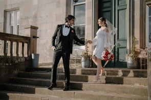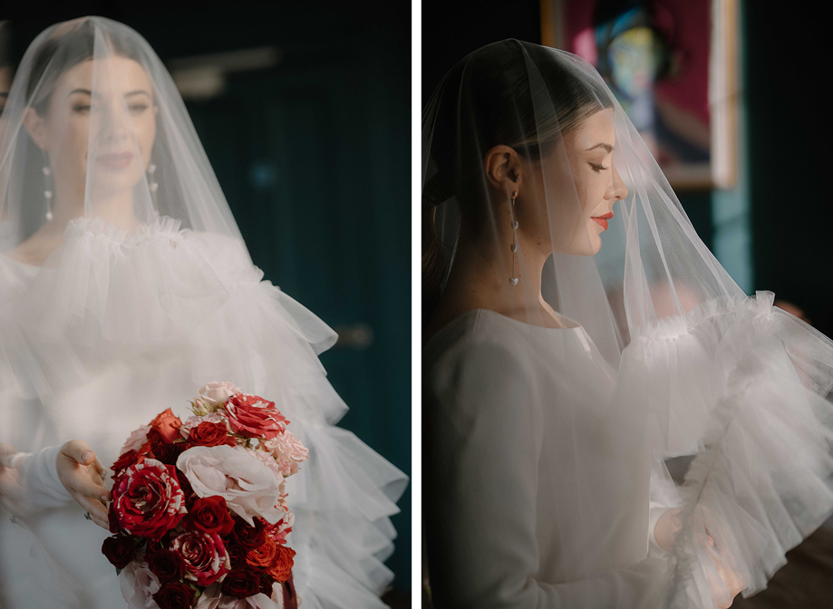 Lauren tells us more: “For the bride’s look we had two dresses: a sleek fitted Pronovias gown from Edinburgh bridal store Kavelle Couture, paired with a dramatic ruffle veil from The Dress Detective and a short sequin dress by Morilee from Broxburn store Gwenne Wedding Services. The heart earrings from Penny Pearl Bridal Co. were the perfect finishing touch.”