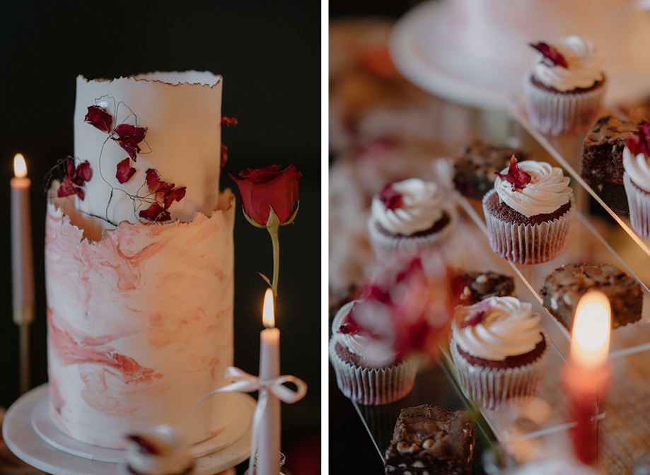 More delightful details came via East Lothian cake maker Me Baked, which pulled out all the stops to create a full cake display that included a scrumptious two-tier marble wedding cake, brownies and red-velvet cupcakes. Yum.