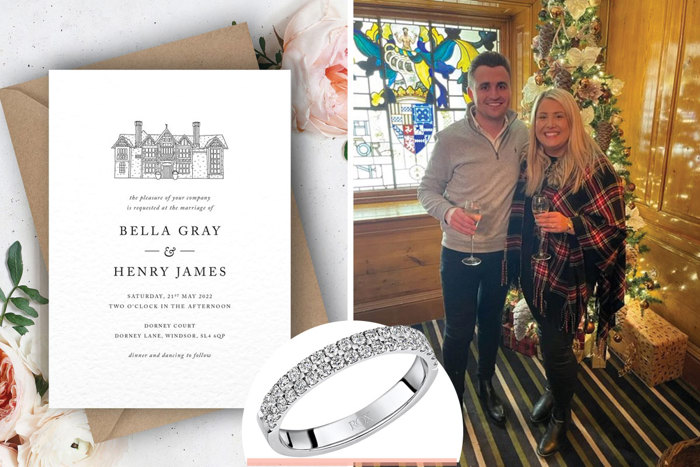 From left: May and Stuart’s invites will be similar to this one from Bloominvitationsuk on Etsy; We wonder if May will go for all-out sparkle from ROX? Double-row diamond wedding band, £2,095; May and Stuart themselves