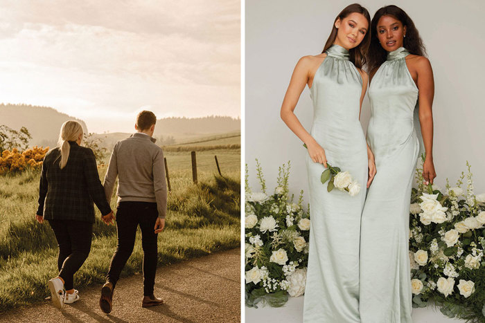 (Left) May and Stuart take a wander with photographer Eilidh Sutherland on their engagement photoshoot; (Right) Pretty Lavish is one of the bridesmaids’ options May is considering. Odelle maxi dress, £85
