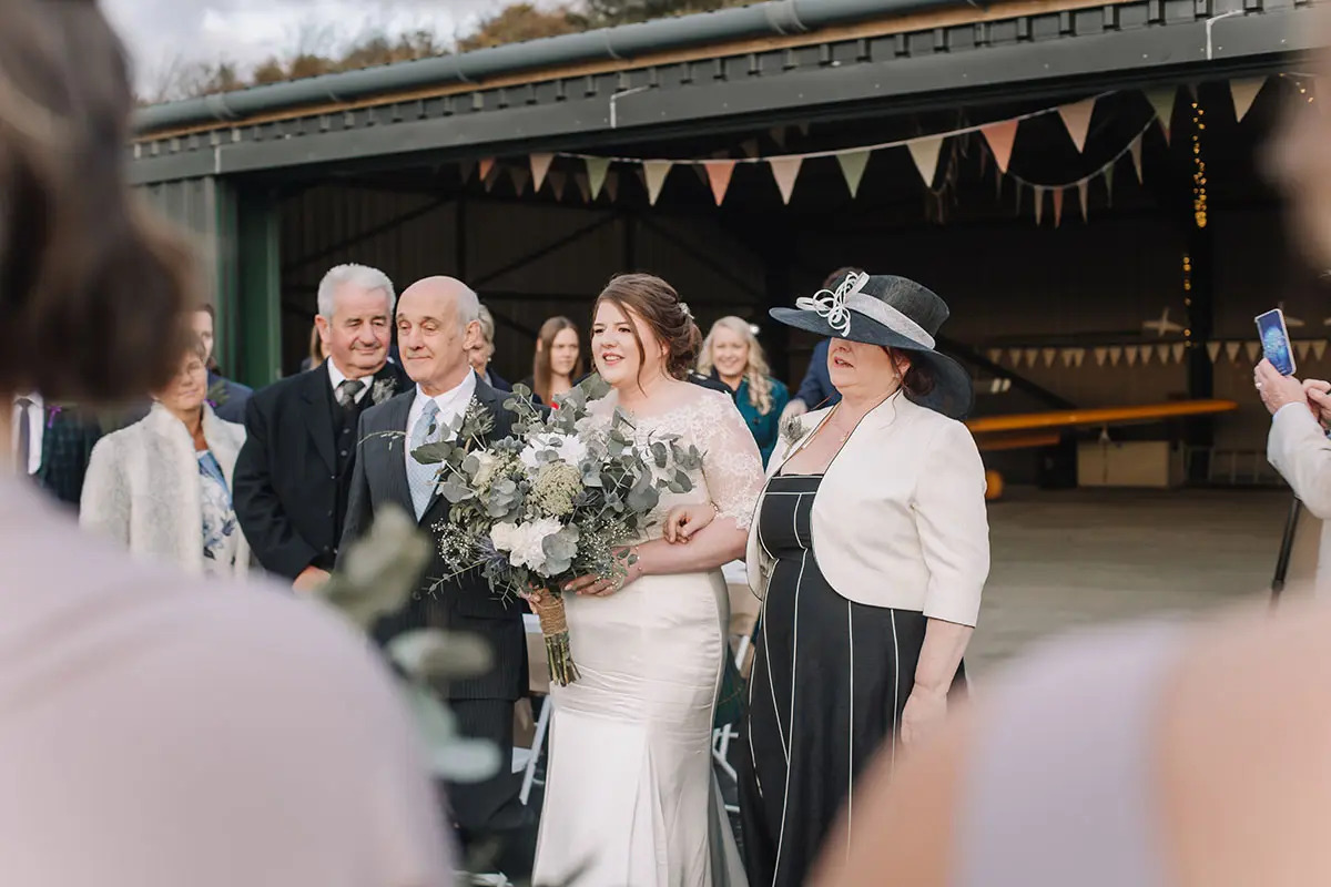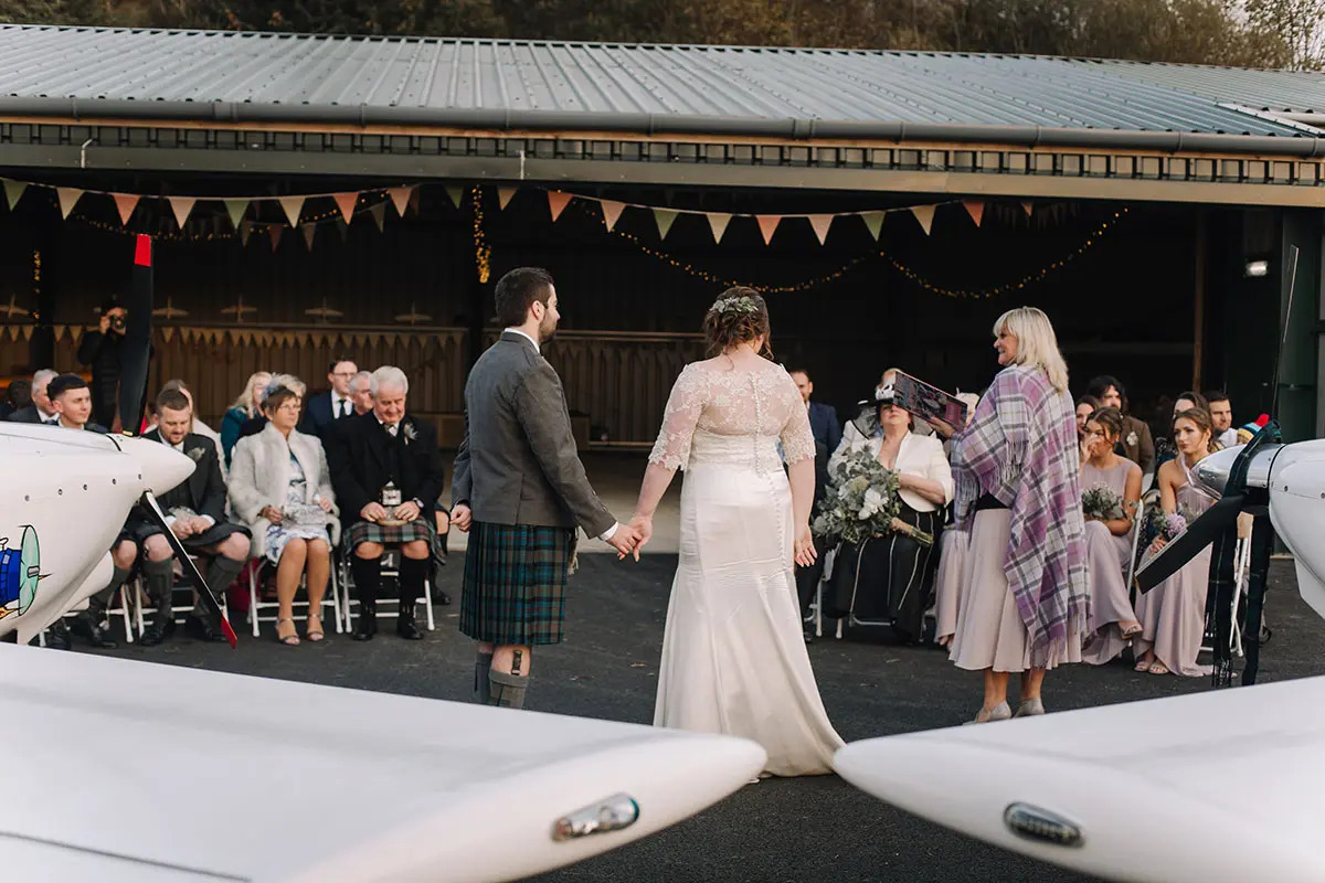 Weather was a big factor with us hoping to marry outside. We spent the day before the wedding freezing our fingers off, decorating the airport hangar with lights and bunting (I’d bought loads!), so it could be used as a back-up ceremony location. It looked really pretty, but in the end we didn’t use the space as the weather was fairer than forecast. It turned out to be beautiful, but very cold. My only slight regret is not hiring more heaters. It got pretty chilly during our vows.