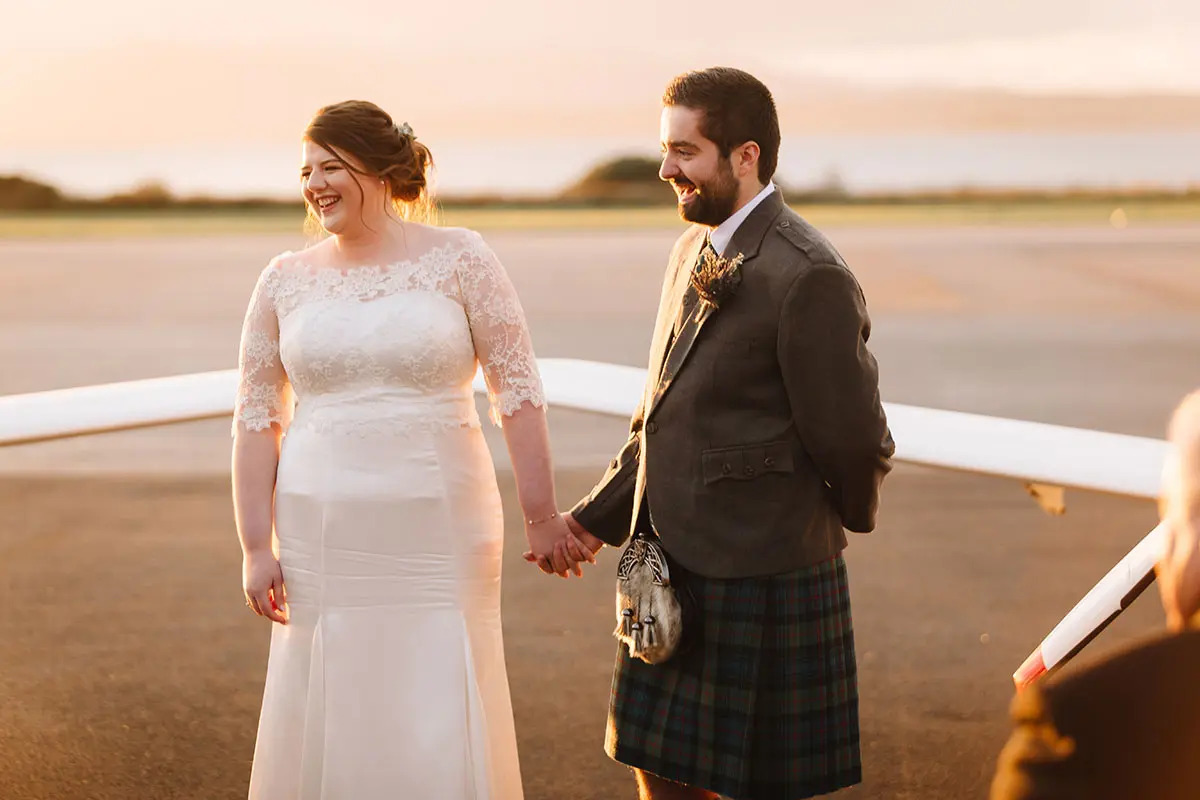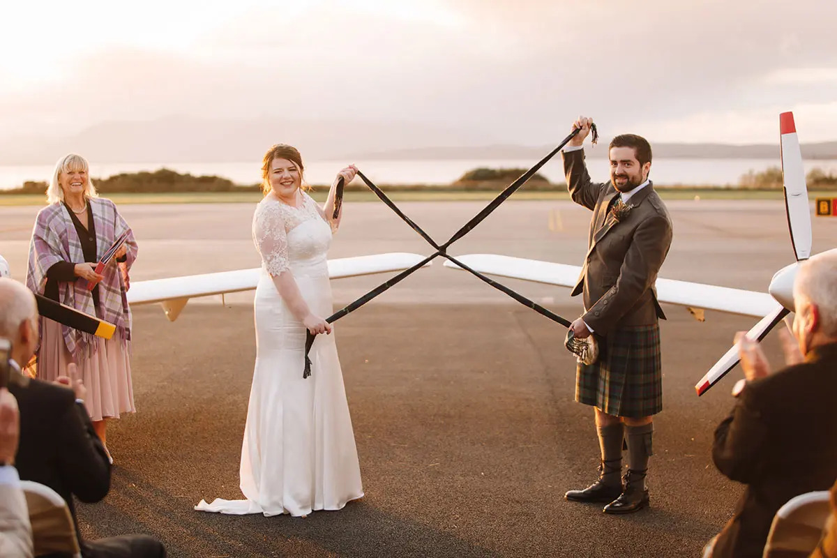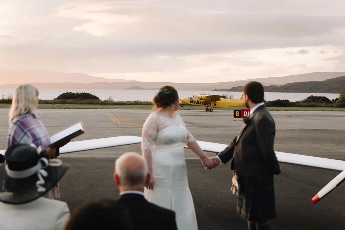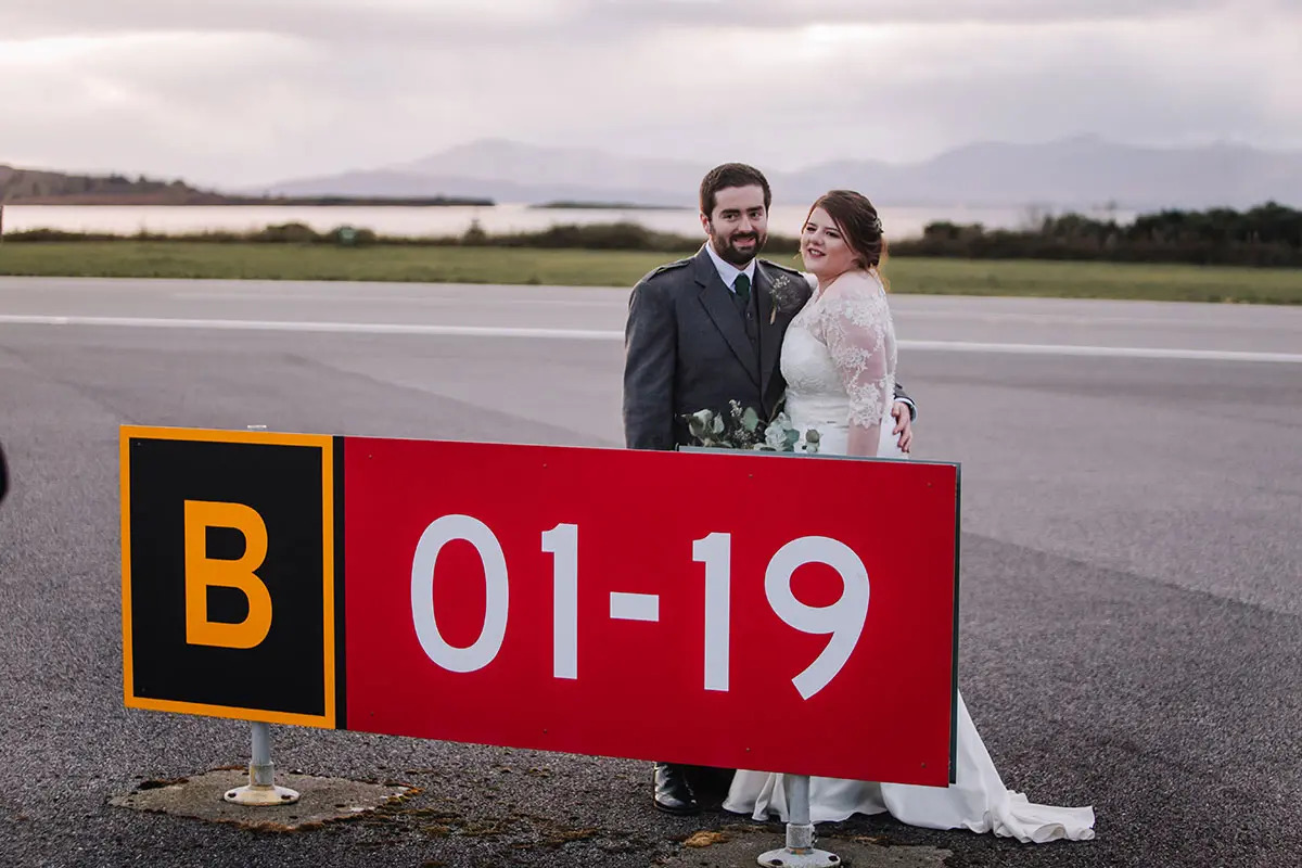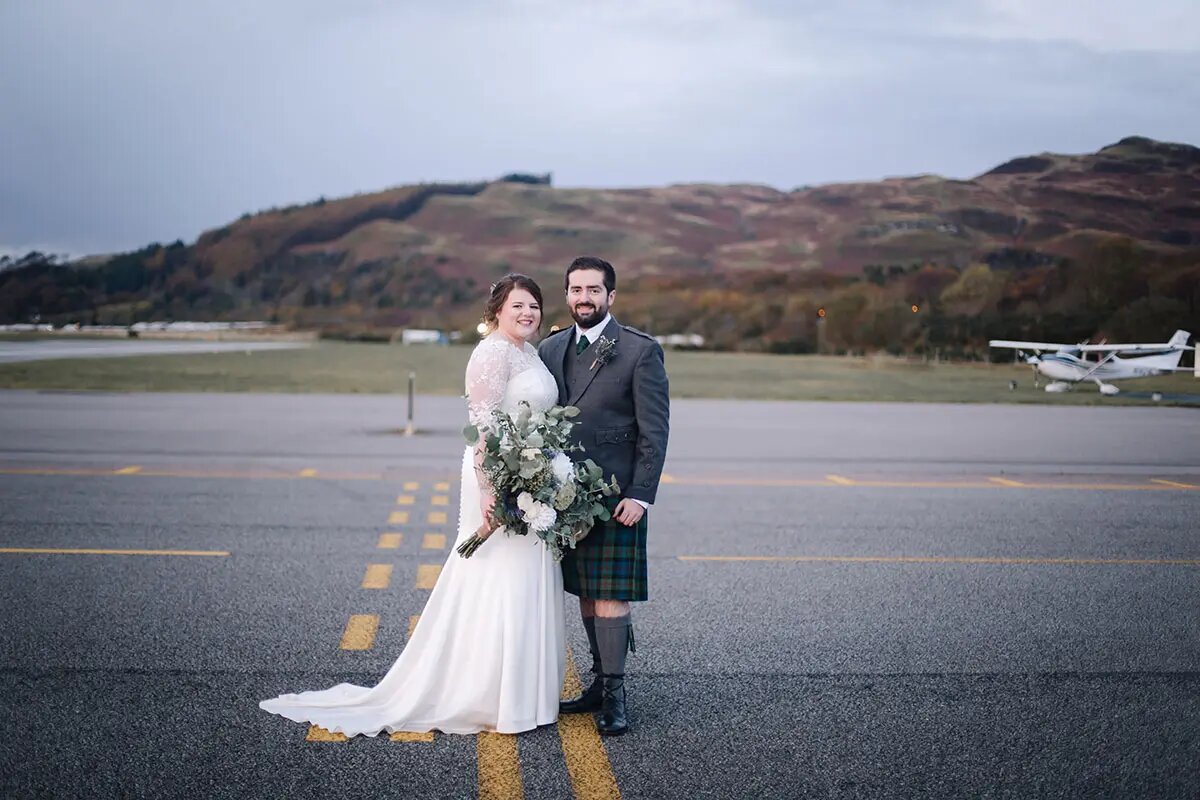 Come fly with this aviation-loving couple who married on the tarmac at Oban Airport with their French Bulldog watching on