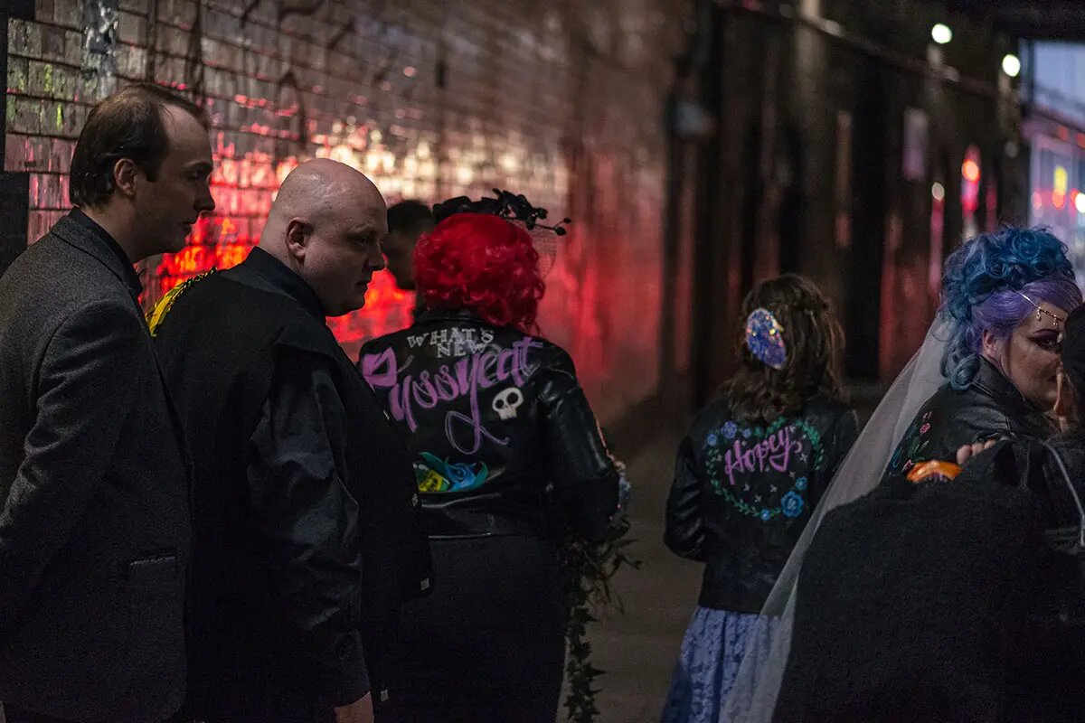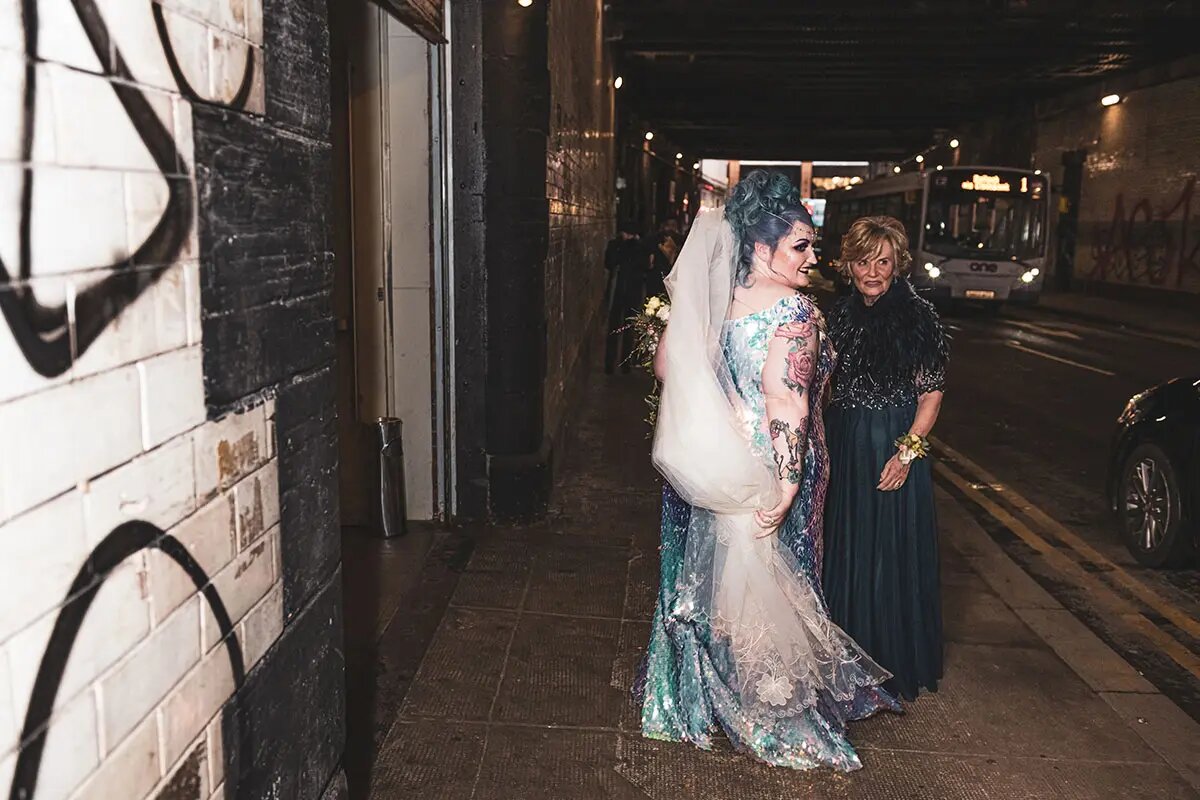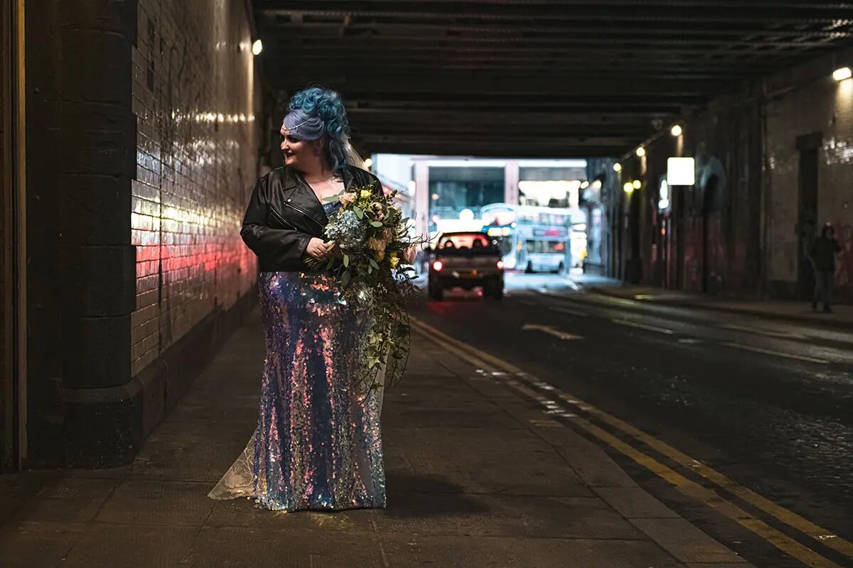 Maggie McAllister made my bespoke sequin gown – she is incredible. She helped me get the dress of my dreams. It was a much more personal and special experience than off-the-peg and I couldn’t love it more. I teamed it with white Doc Martens, a necklace of my mother in law’s in my hair and my mum’s veil.”