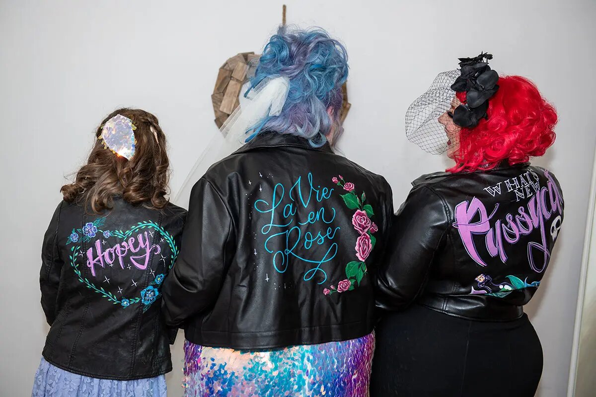 We are both wedding suppliers so we put a lot of our own touches into the day. Stu did an illustration which we used on the invites, I also hand-painted biscuits, we made activity books (which also worked as place settings), we had tea towel favours, and I painted some leather jackets for my ‘best wummin’.