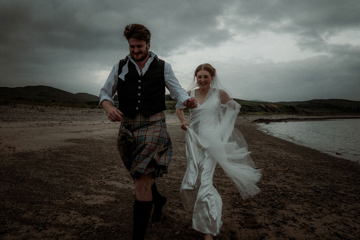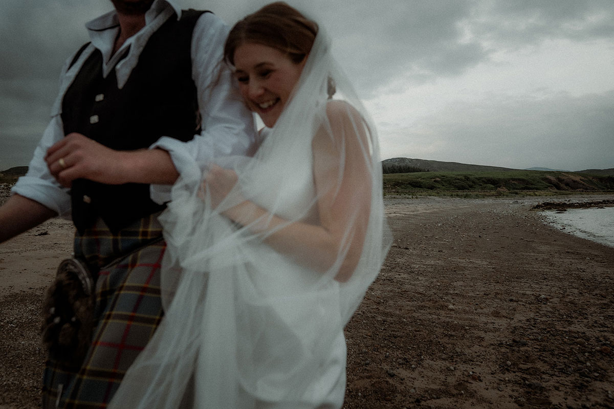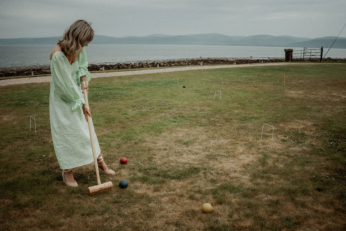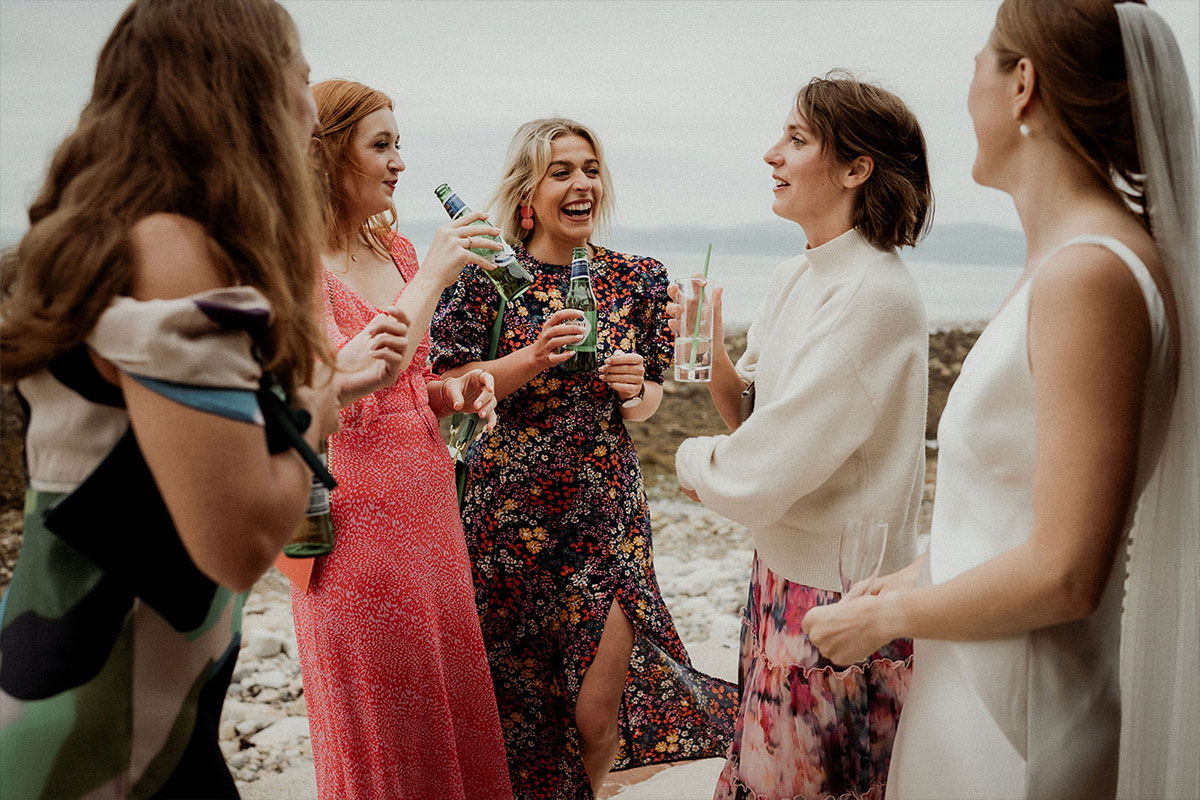 “Being by the water having our first drink together after the ceremony was amazing,” she adds. “We were lucky with the weather as it was so refreshing and the perfect way to decompress after exchanging vows. My favourite photos are from that part of the day. Then, in one of the breaks in the ceilidh, James and I sneaked off down to the beach to watch the sunset together.”