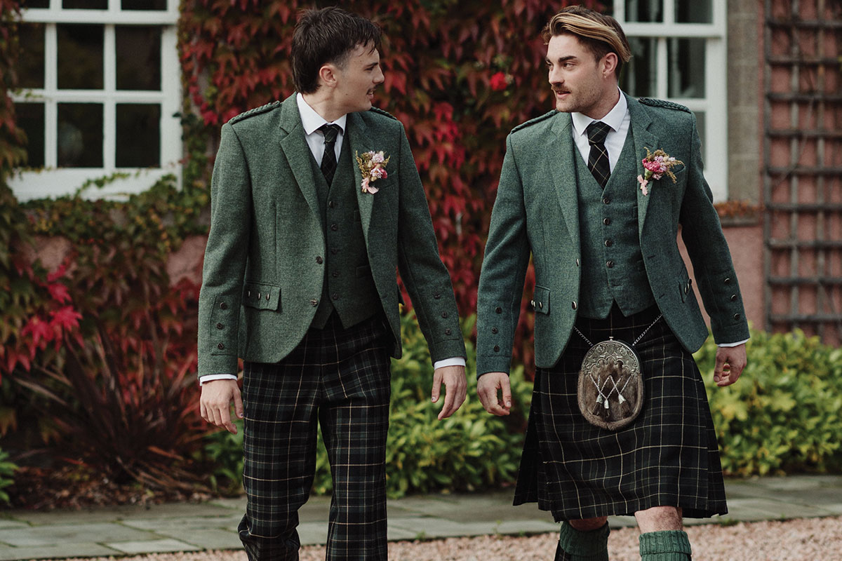 Borders castle wedding venue Neidpath Castle hosted these two grooms who opted for custom-made kilt outfits from Geoffrey (Tailor) Kiltmakers. They poured their hearts into creating a meaningful humanist wedding ceremony featuring personalised rituals like the oathing stone and quaich.