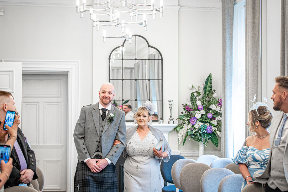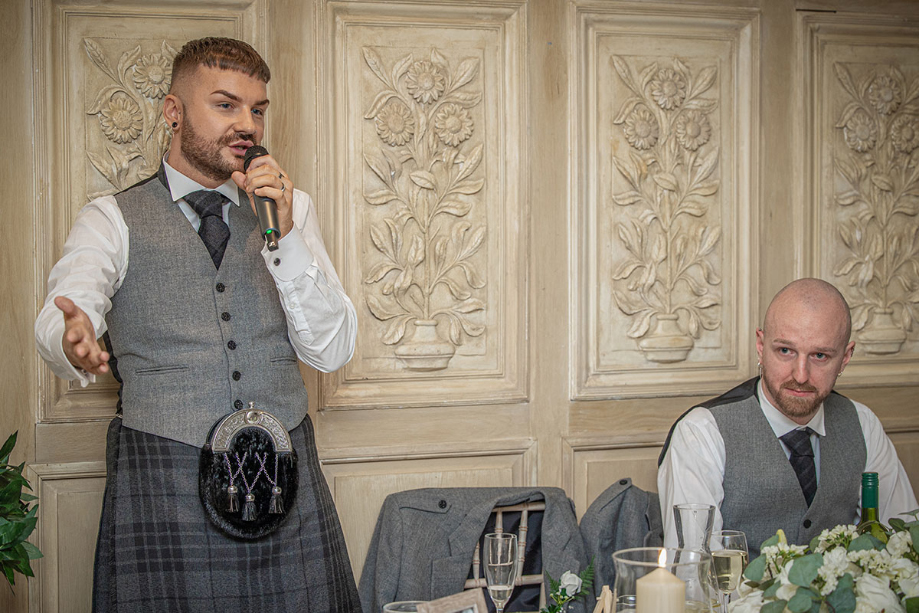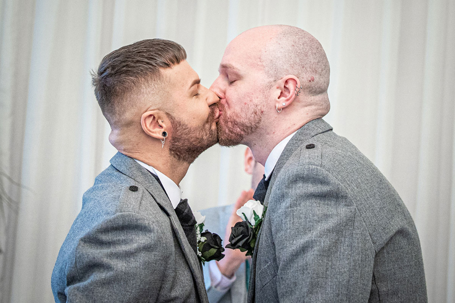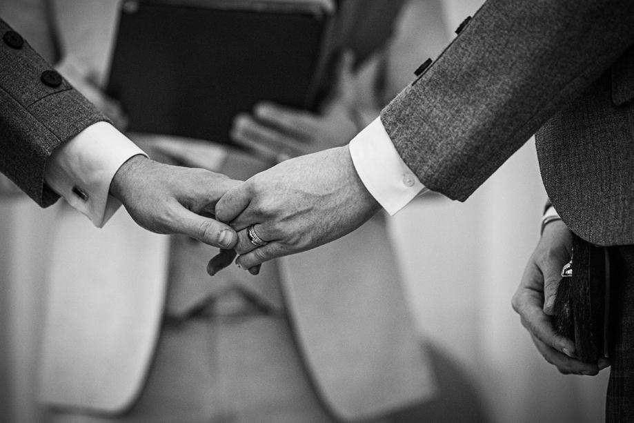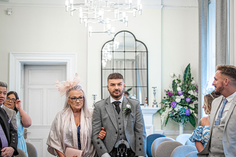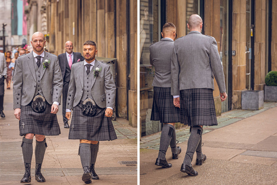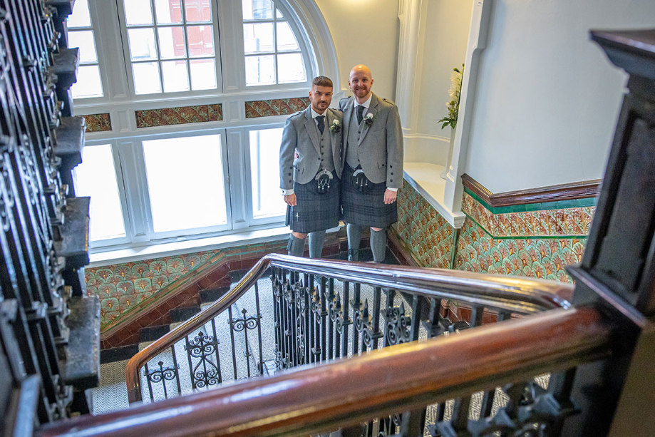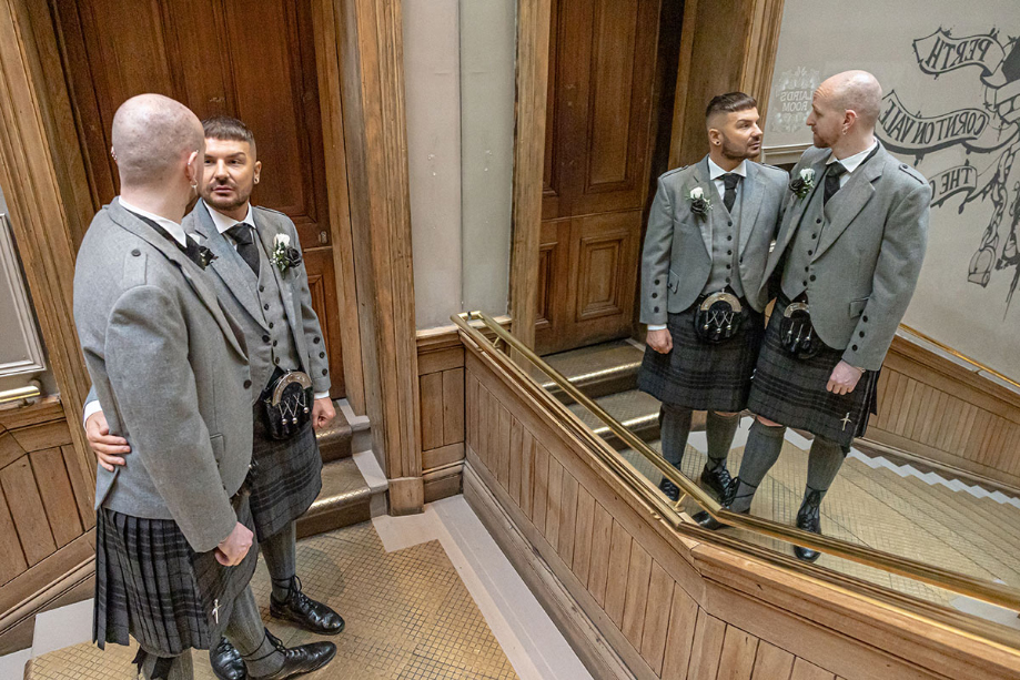 We hosted our ceremony at 23 Montrose Street at Glasgow City Chambers. Assistant Registrar Antonio Reilly led proceedings in front of our assembled nearest and dearest. We kept things straightforward and decided not do our own vows as, for us, it felt like unnecessary added pressure. Our mums walked us down the aisle and our dads signed the register.