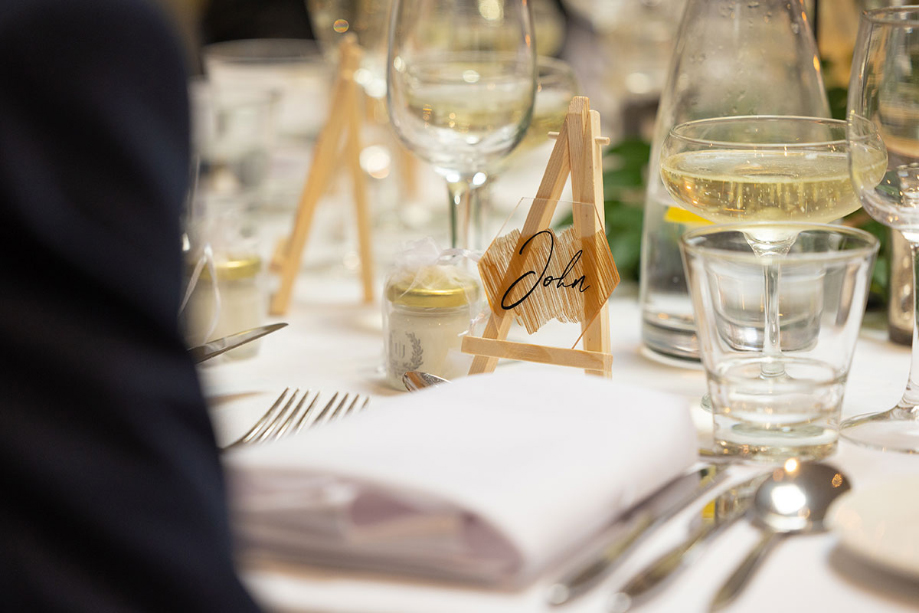 Once we’d booked our area for dinner at The Corinthian, ideas began to flow. Jie has a creative mind, so he suggested lots of candlelight with eucalyptus and fern decor which suited the carved wood in the room. It all came together beautifully.