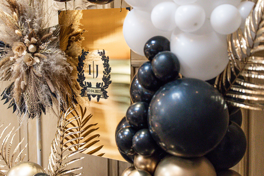 We handmade our wax seals for our invitations with a crest logo that we had designed especially for our stationery. We also printed the crest on our favours and had a bespoke balloon arch made, also featuring the monogram.