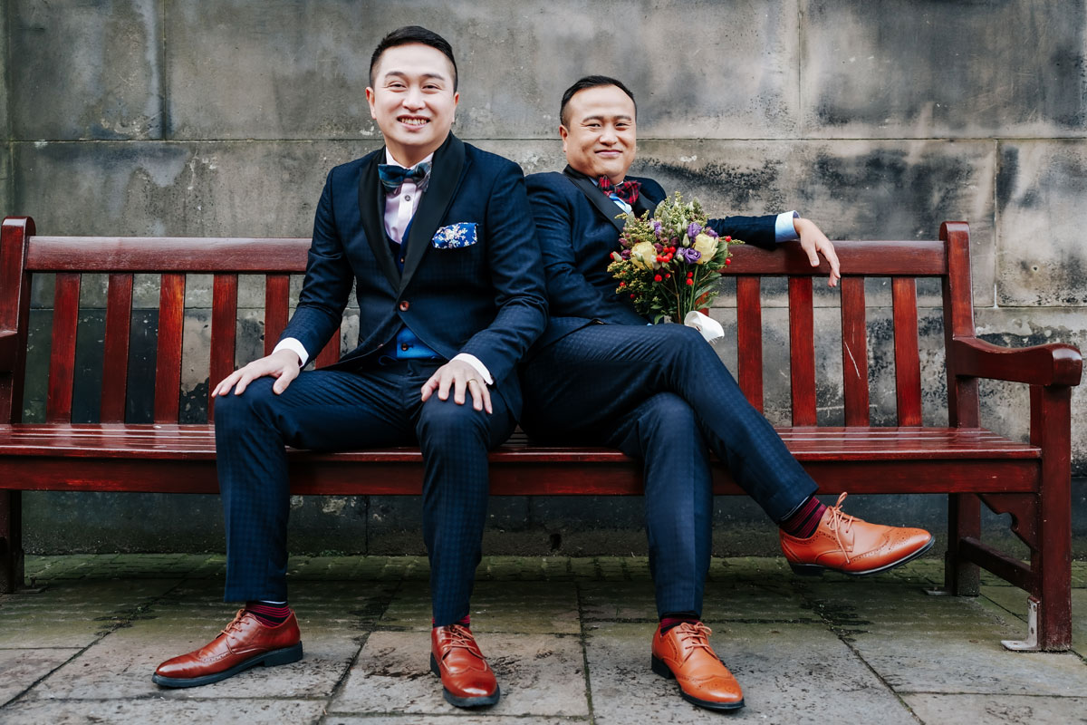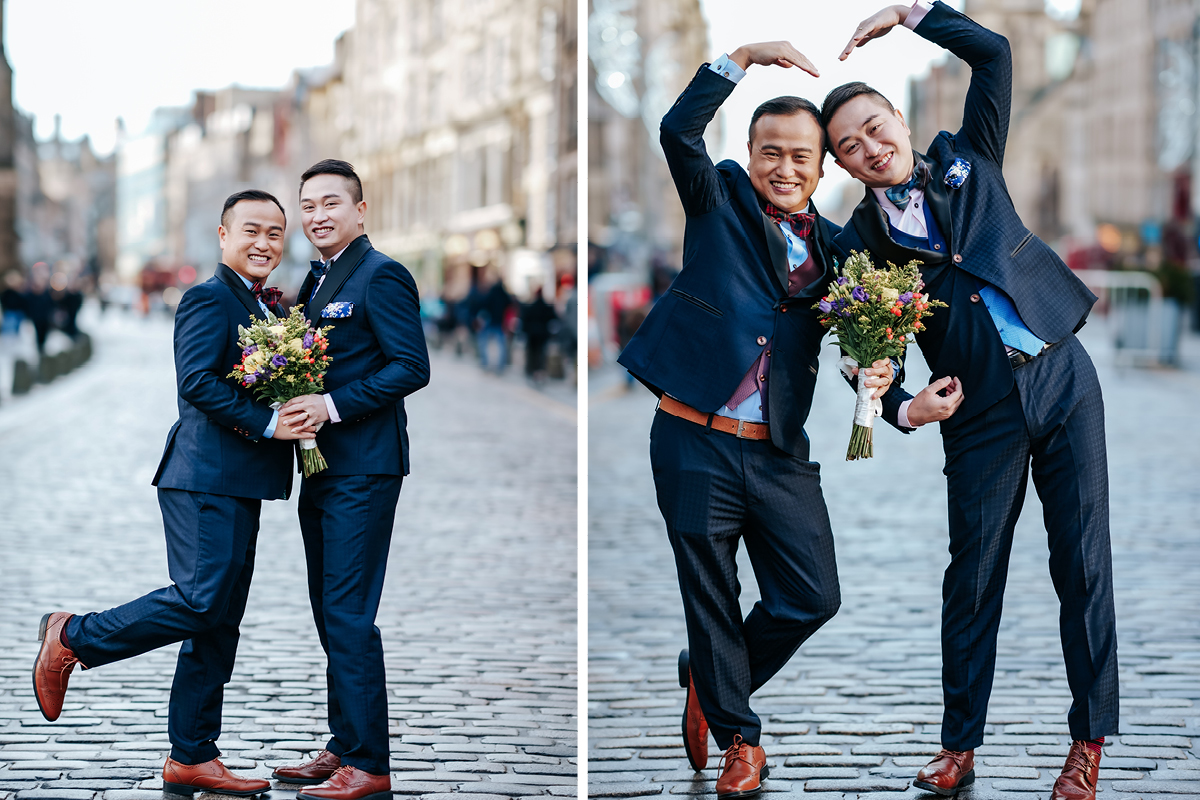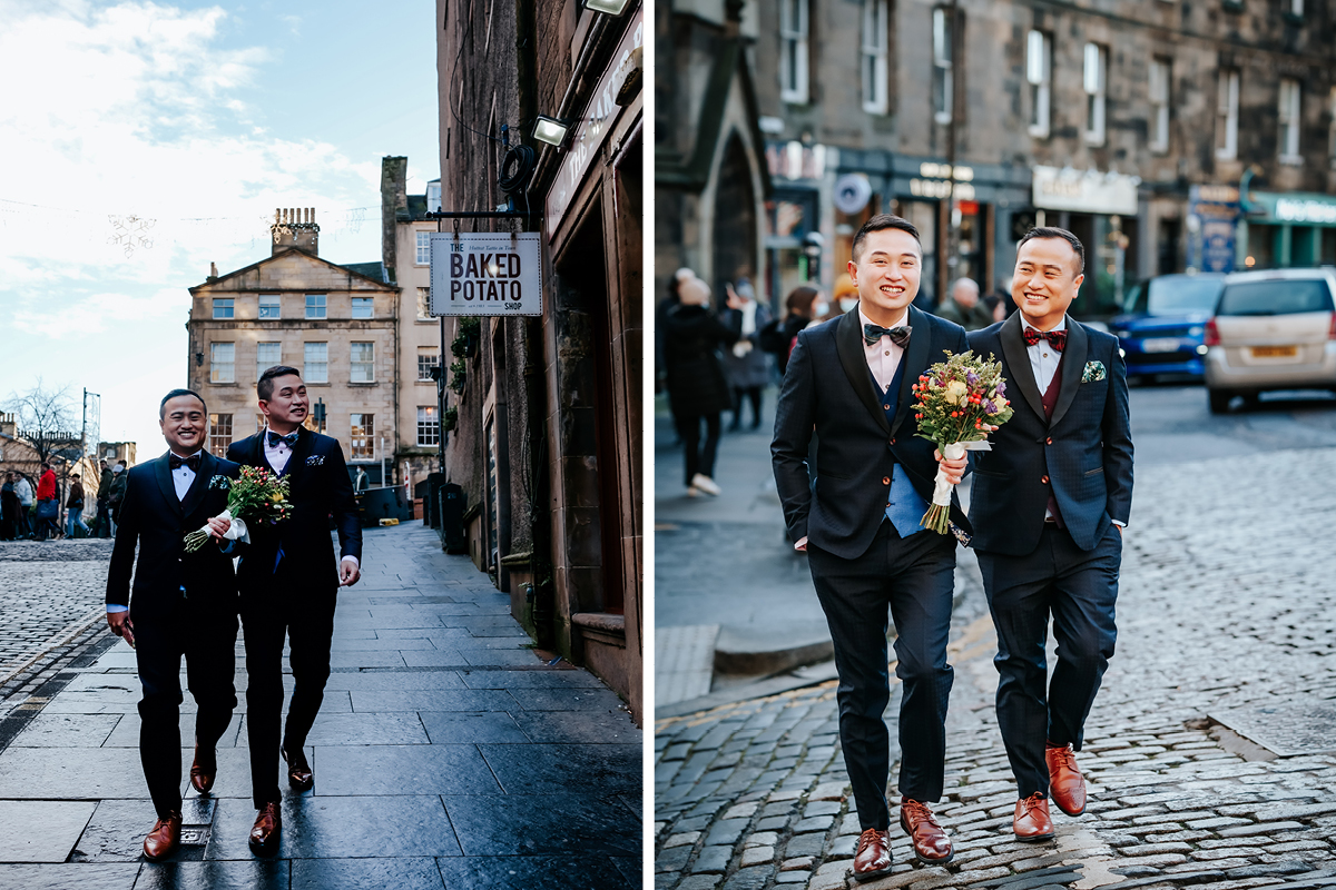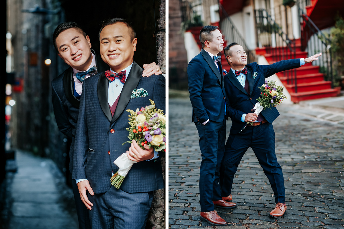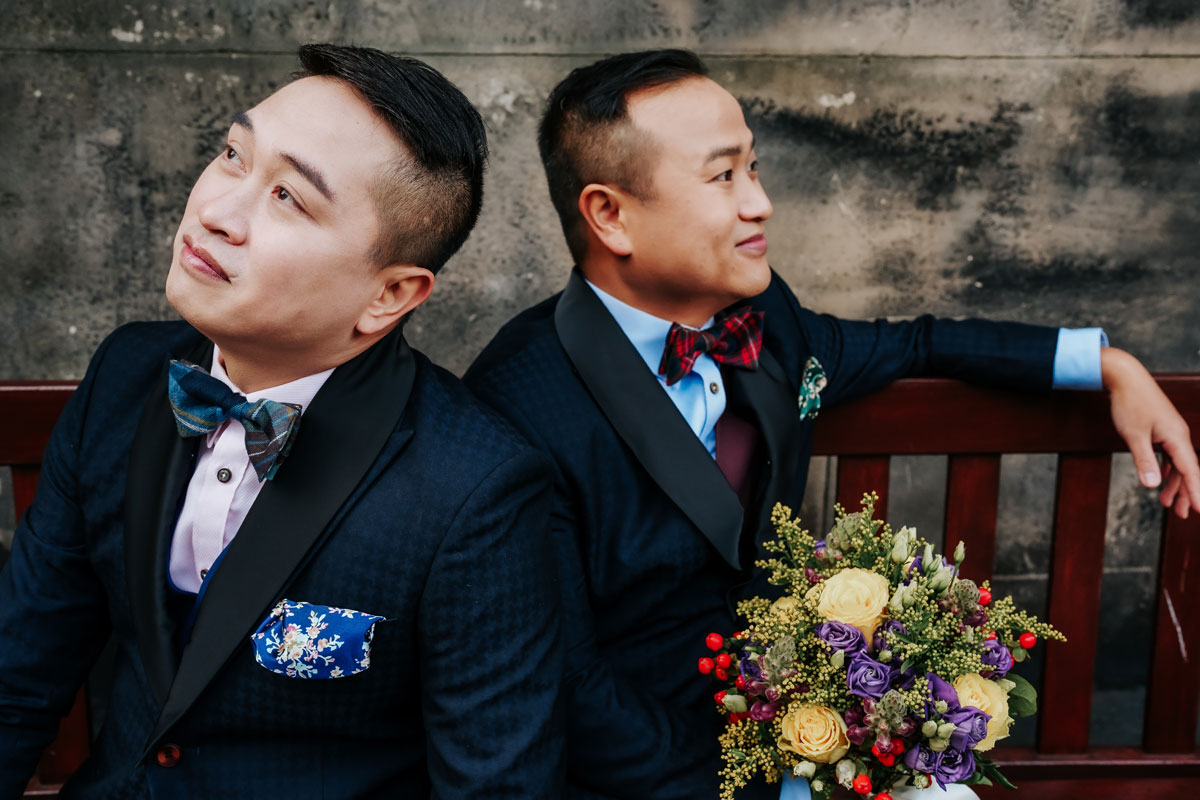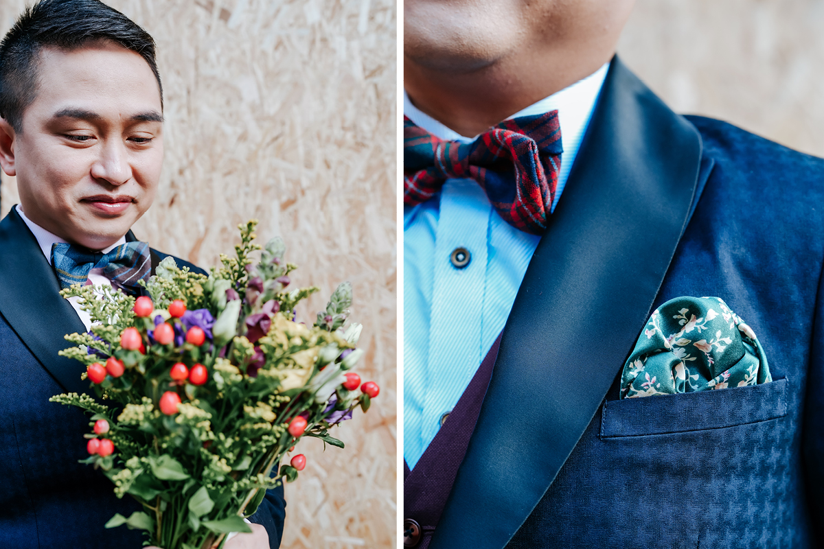 We loved our suits made by Mijosu in Hong Kong. We chose the fabric and buttons and they took three months to finish. That said, our only slight regret about the wedding is that we missed the opportunity to wear kilts.”
