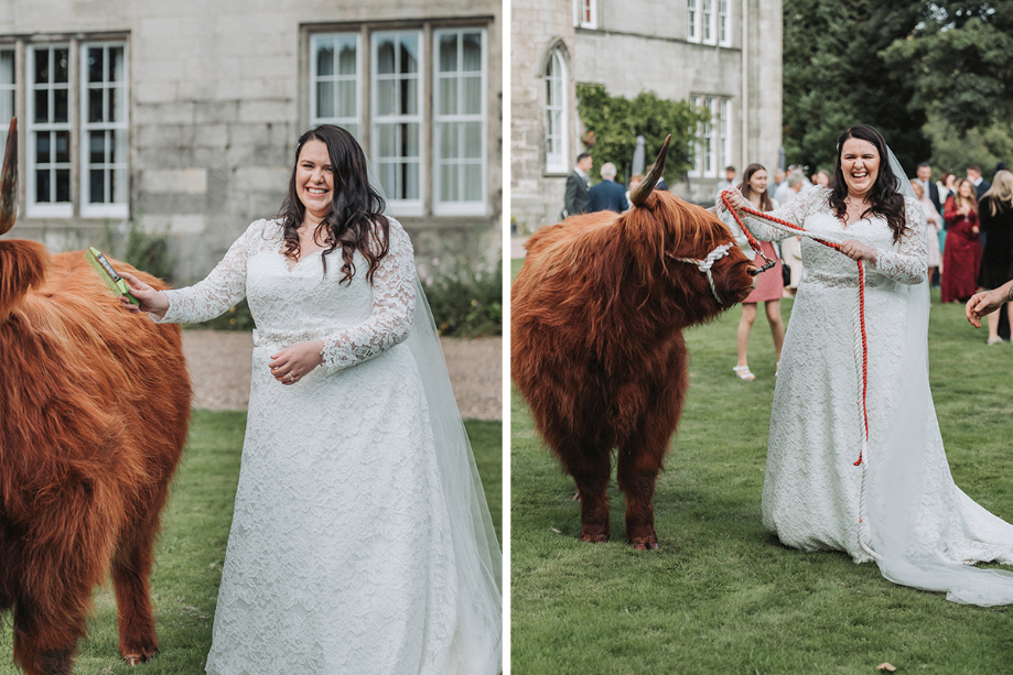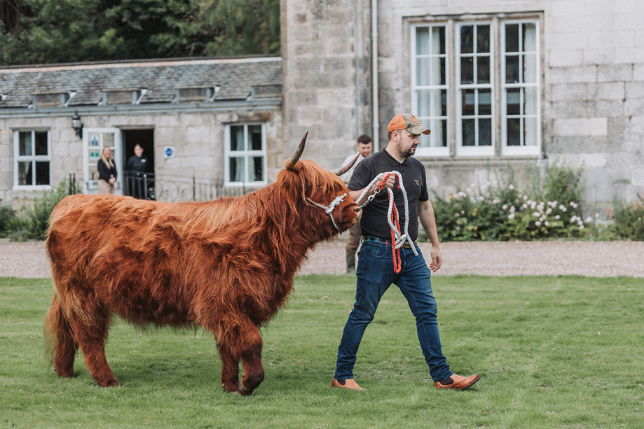One of the day’s biggest surprises was the appearance of a Highland cow! I’ve loved them since I was a little girl, so unbeknown to me, my dad arranged for one to greet us back at Melville Castle. We got to take her for a walk and brush her hair. Our daughter loves them too, so she was also very happy!”
