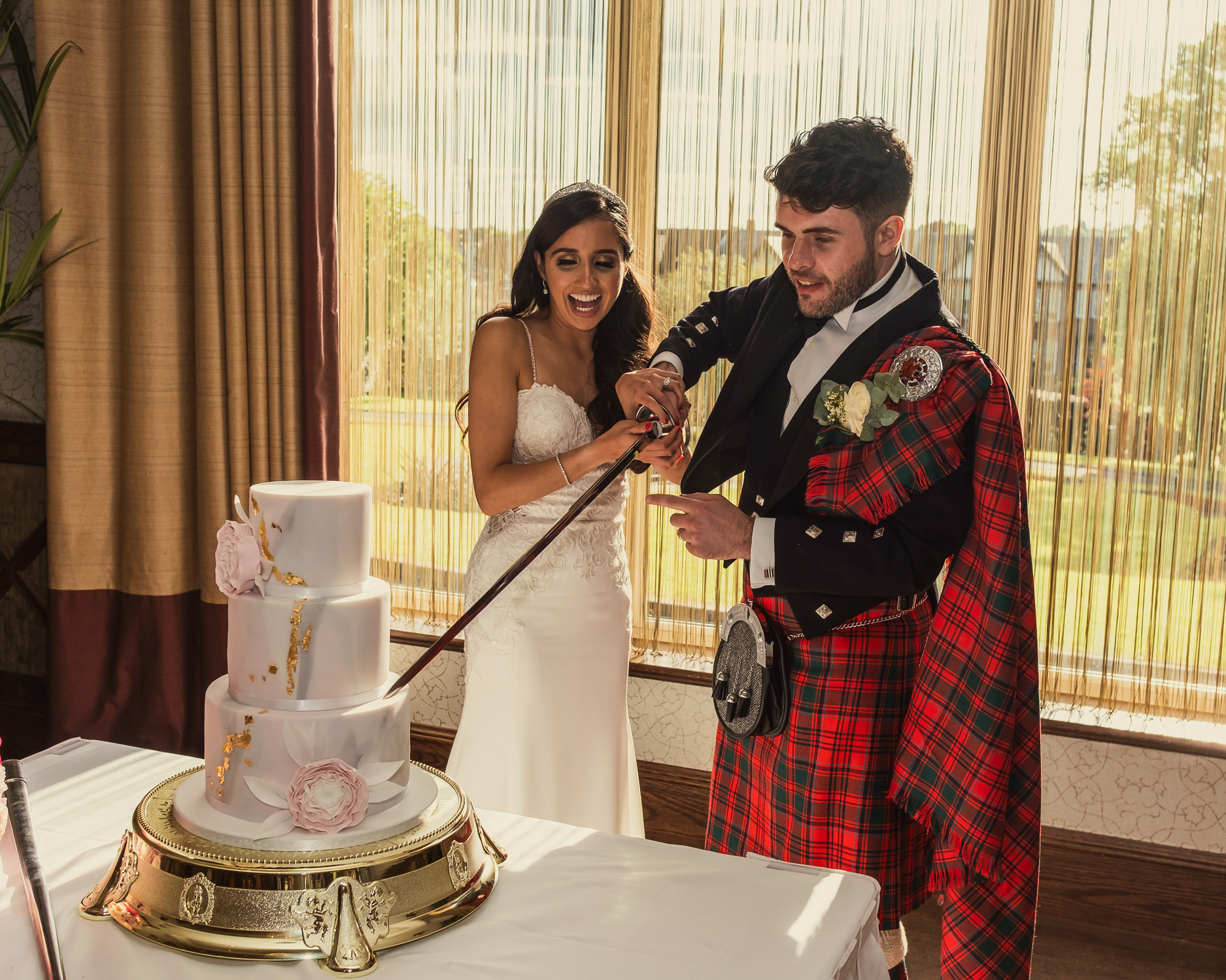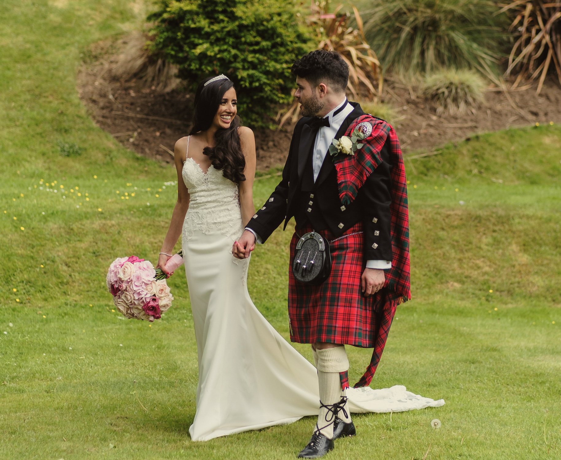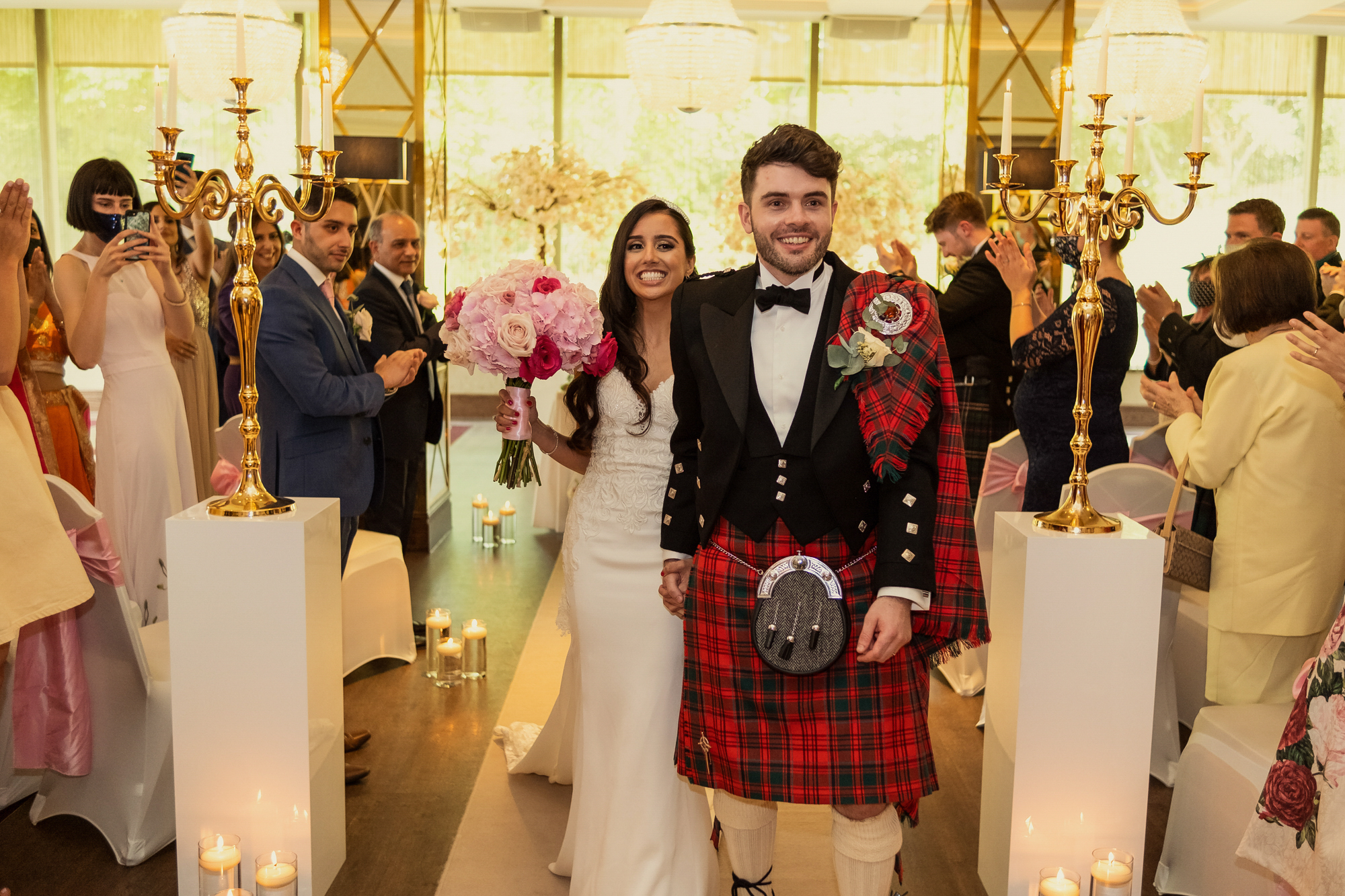 We really wanted to incorporate both David’s Scottish heritage and my family’s Pakistani background. The first half of the day was more traditionally Scottish, with David and his family wearing kilts, while I was in a white dress.