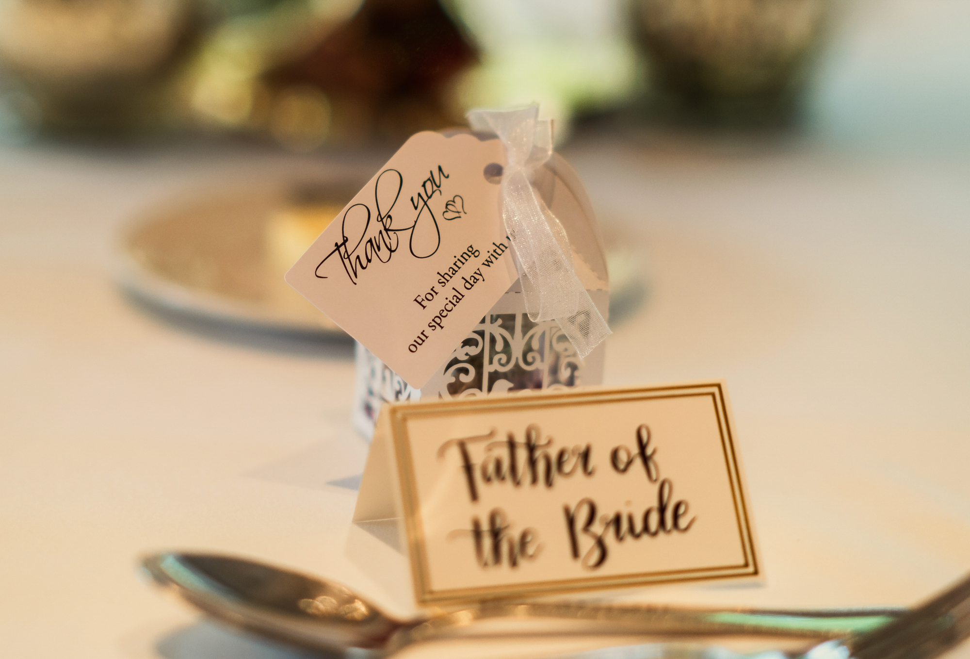 My vision for the decor was ‘fairytale glam’. Boclair provided us with a beautiful mirror for the table plan and we complemented this with a ‘welcome’ mirror sign from our wonderful styling company Supernova Wedding Design and Flowers. We made fun of our multiple Covid-related postponements by having all three of our wedding dates on the welcome sign, with two of them crossed out.