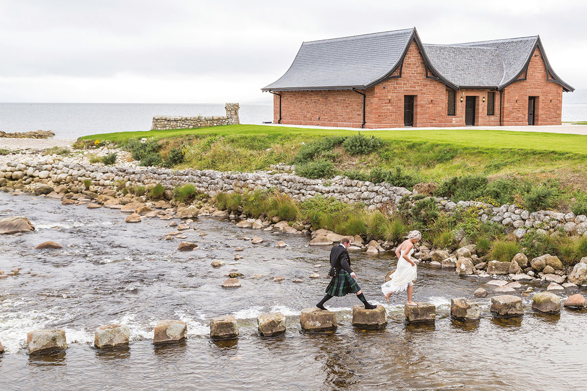 Online searches led them to Dougarie Boathouse on the west coast of Arran, a Victorian summerhouse that had once belonged to the 11th Duke of Hamilton. “We loved that it had been beautifully restored. There are gorgeous historical features, like the original exposed beams and pitched roofs, but the rest of it is a blank canvas so we could incorporate our own style and ideas,” recalls the bride.