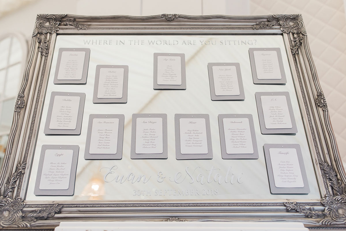 Stationery Invitations by Made by Myself and table plan was decals bought on Etsy mounted on to a mirror by the bride