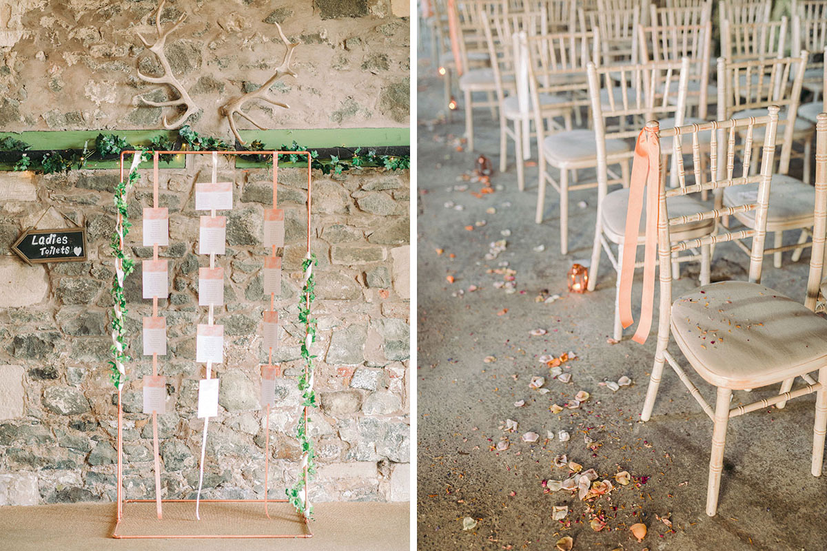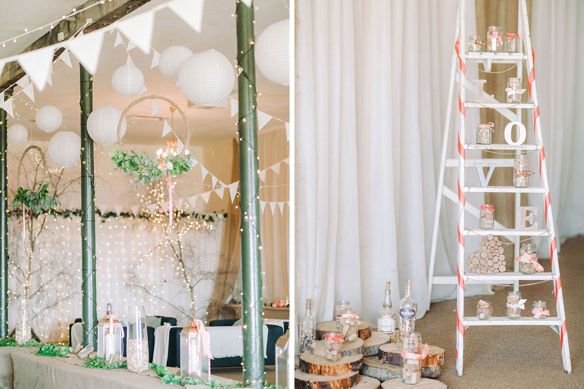 Pratis Barns have a ‘props room’ filled with decorations from previous weddings. You’re free to take anything, and we used lots of bits and pieces to add the finishing touches to our venue, which made all the difference. We also decorated the venue with lots of corks, and named the tables after our favourite pubs and bars in Glasgow.