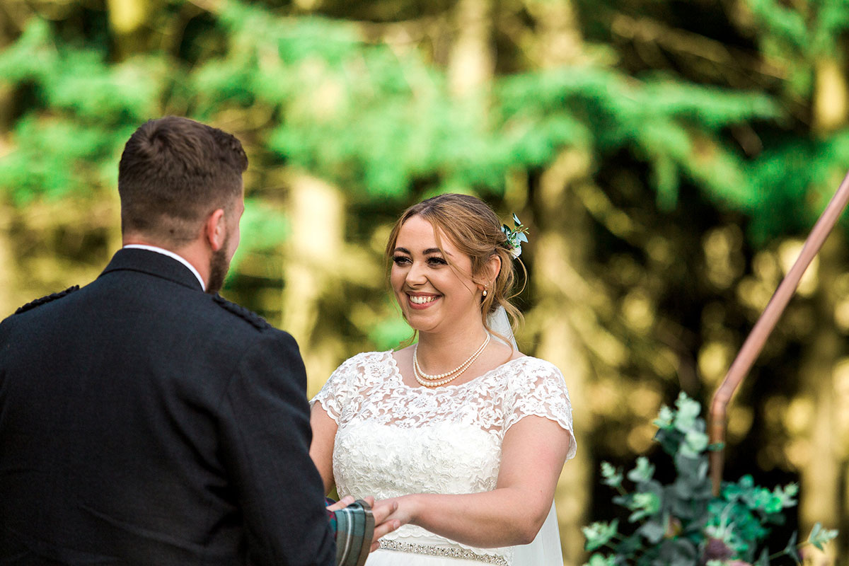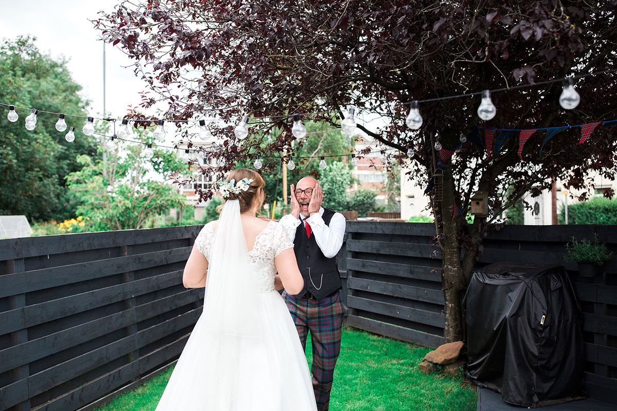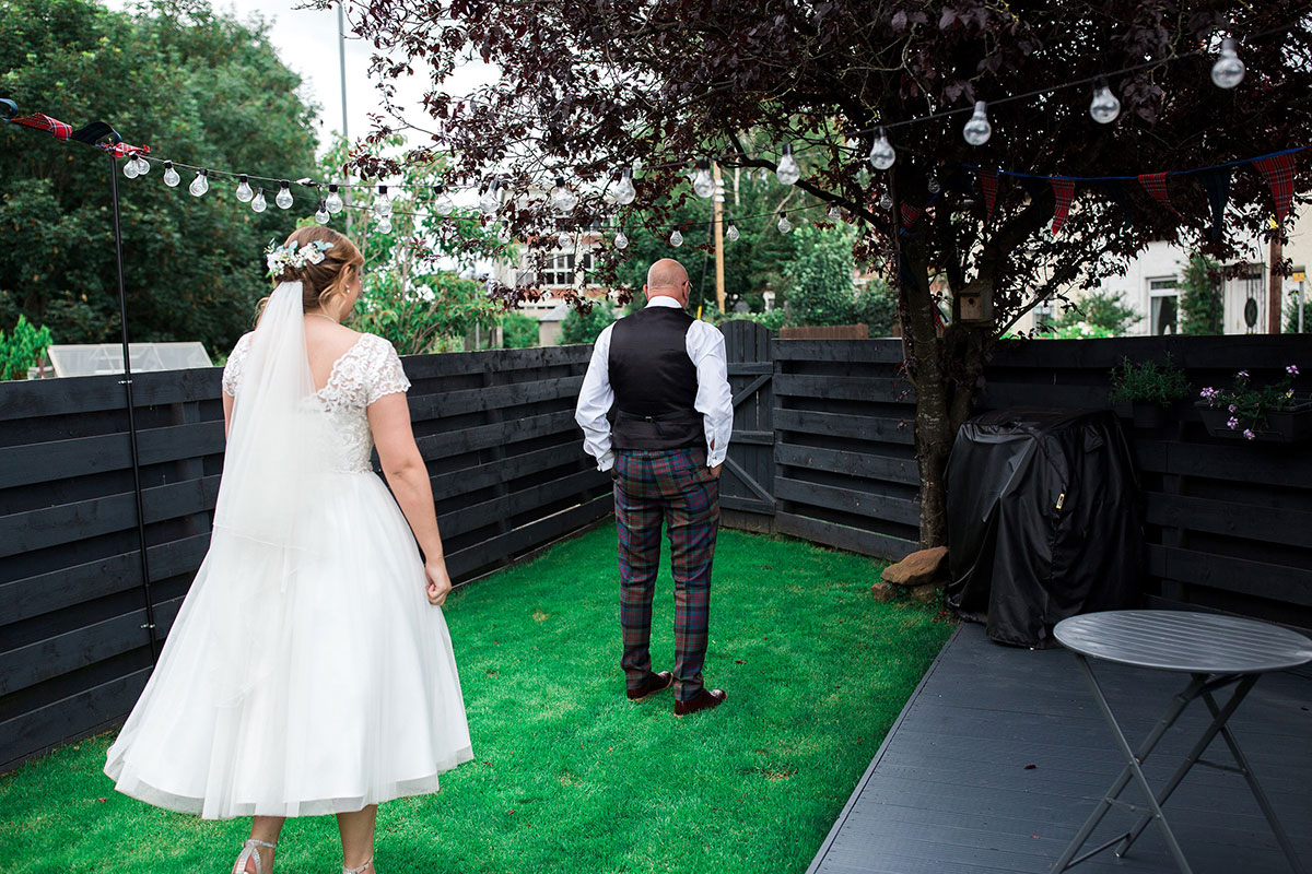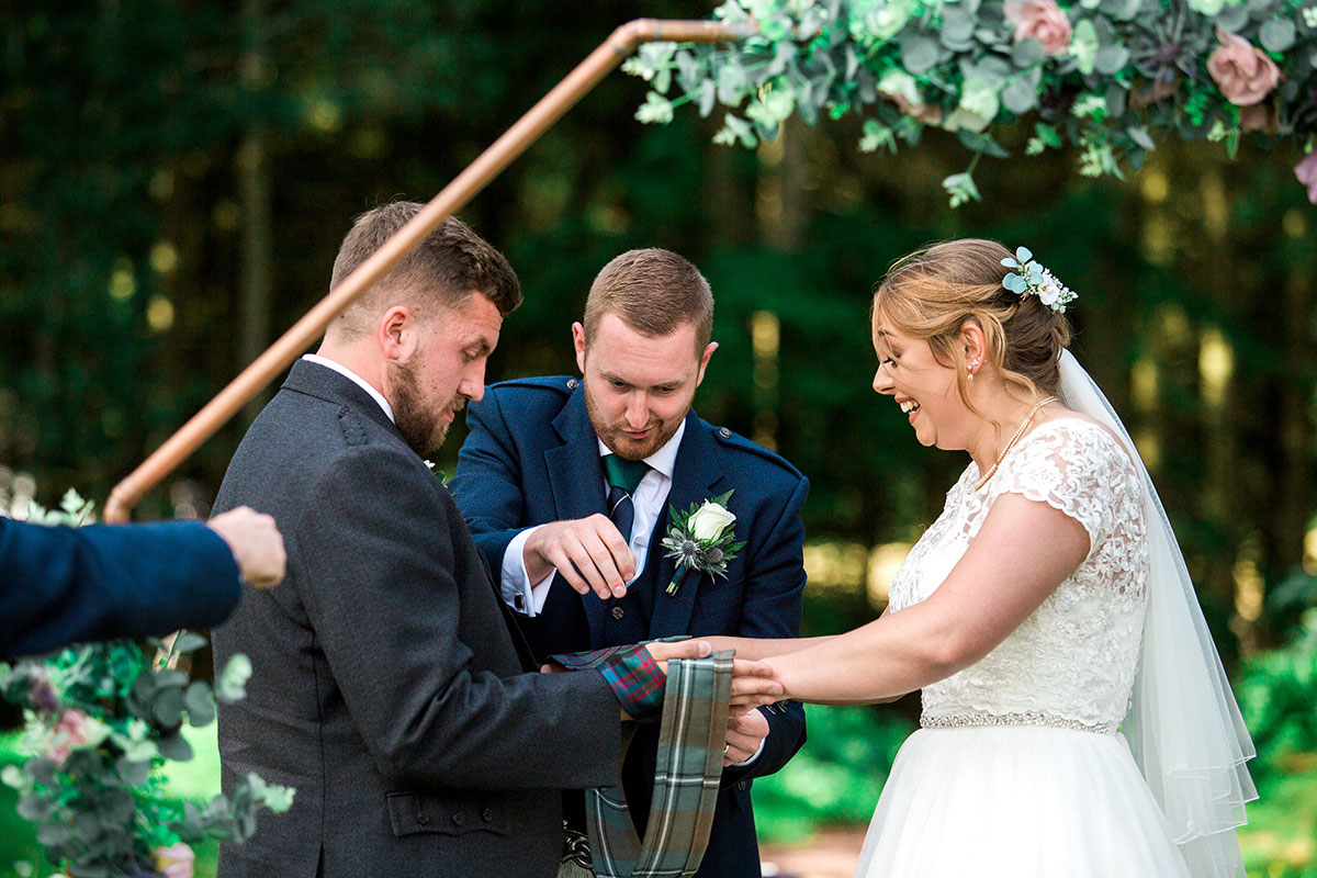 During the ceremony, Callum’s brother had a difficult time setting up the ribbons for the hand fasting. Because of social distancing, the celebrant could only talk them through the process, not actually touch and show. I was chuckling throughout as he almost tied himself in knots. After a few minutes (and a few swear words!), he got it sussed.