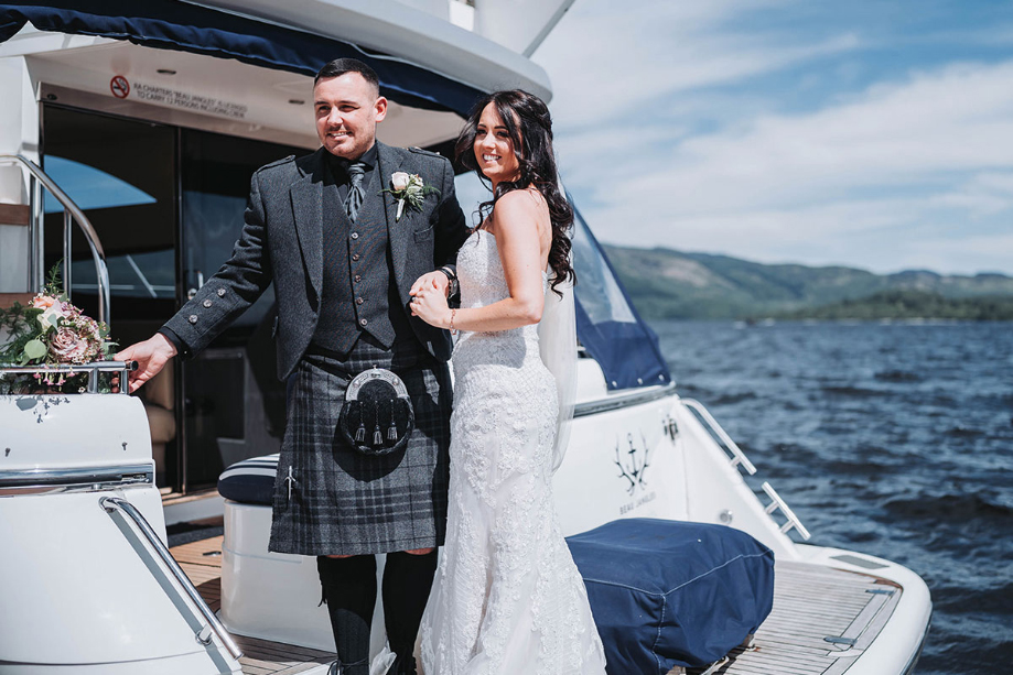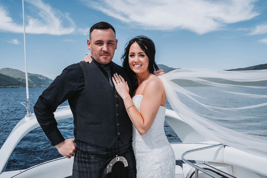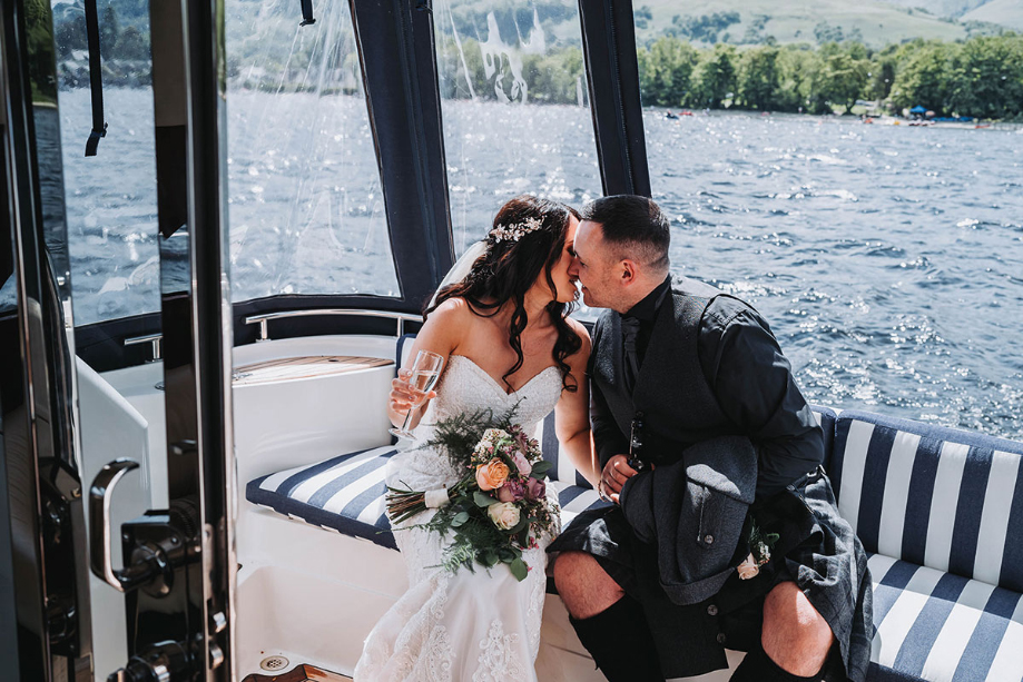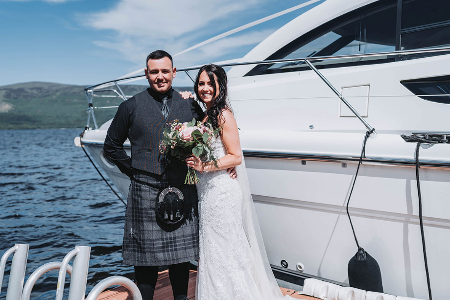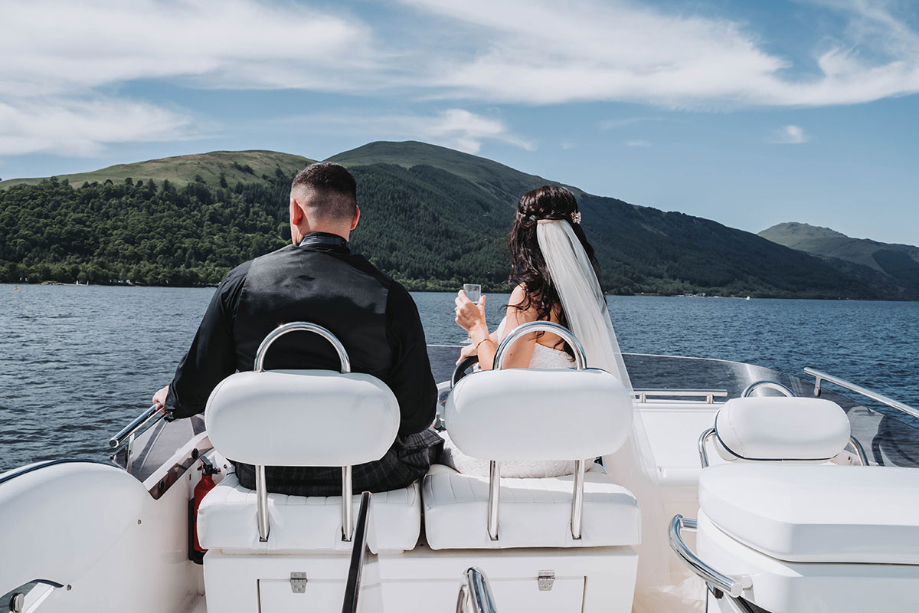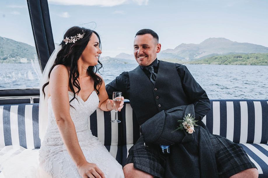 One of the day’s highlights was the boat trip we took in the sunshine after the ceremony on yacht Beau Jangles. Our neighbour’s son Rhys piped us onboard, and we went out on the loch with a glass of champers in hand. Our guests all got a shot on the boat too.