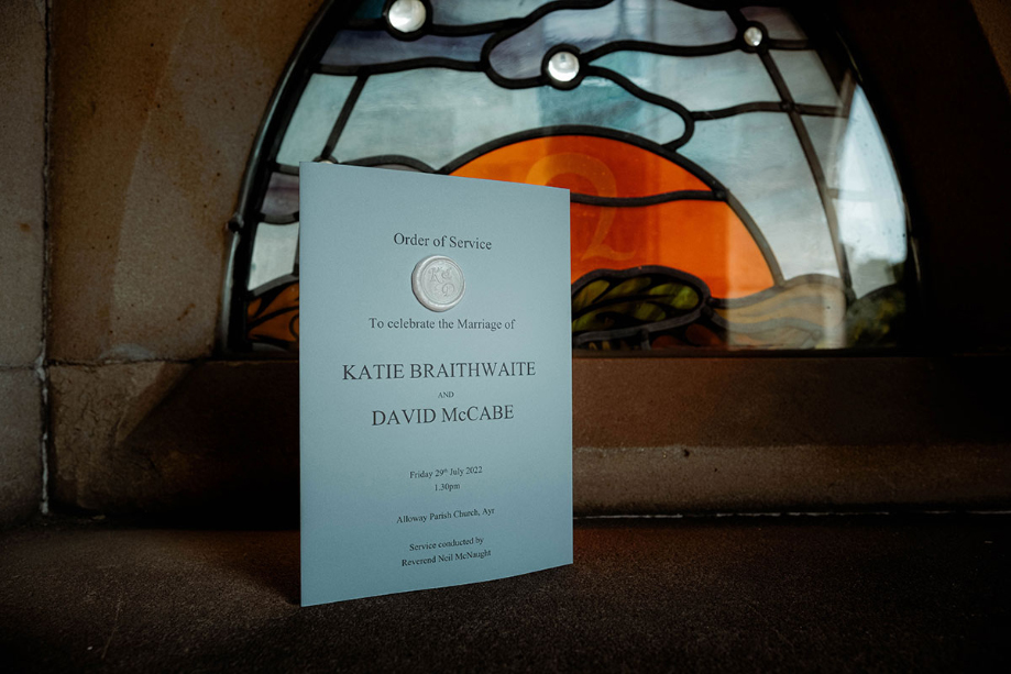 We booked our wedding venue a month after we got engaged. We had taken brochures for eight places and visited two before finding the perfect venue. We chose Brig O’ Doon in Ayr and Alloway Parish Church.