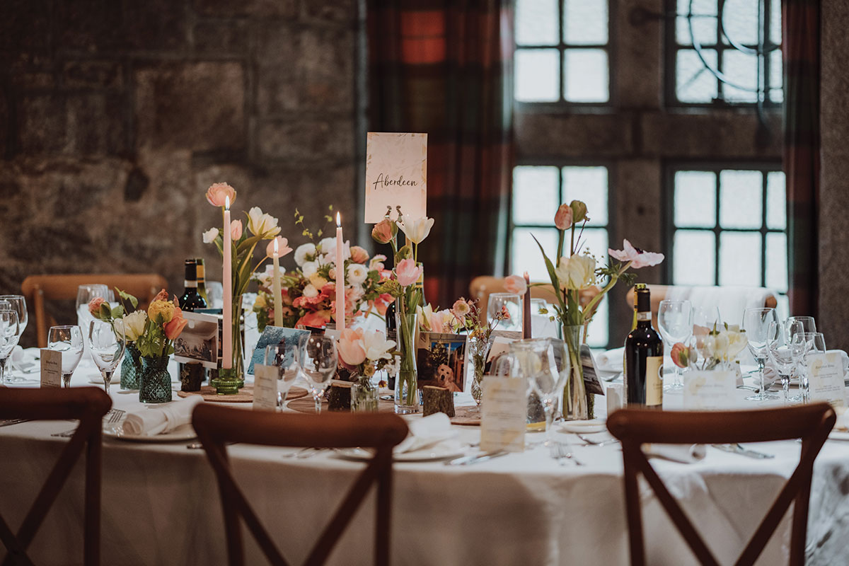 Jon and Elly took inspiration from Glen Tanar’s stunning surroundings for their decor. “It has a strong look and character so we decided to keep the decorations quite natural to brighten and elevate the space,” remembers Elly. “We were inspired by the colours and flowers of spring, so used peach, pink and green tones and local seasonal flowers to dress up the areas where we had the ceremony and reception.”