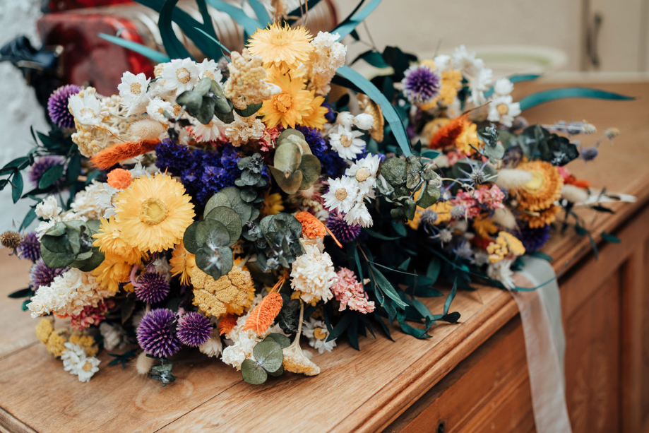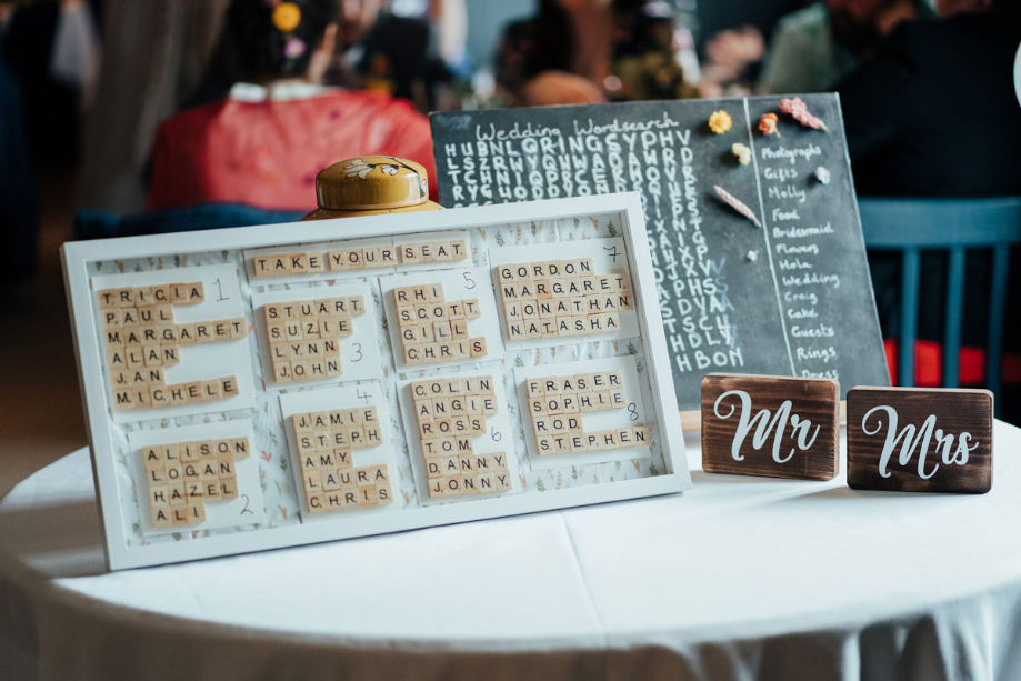 Our dried flowers from Hidden Botantics Weddings featured lots of colour, which gave us a wide palette to play with. We also incorporated board games in our DIY decor for the meal (we have a huge collection at home).