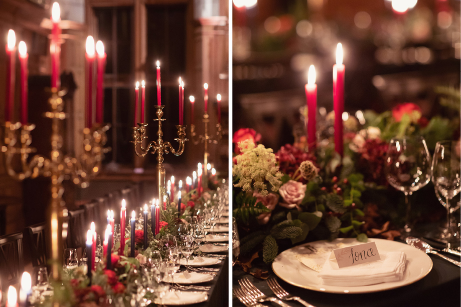 We threw our reception at the romantic and beautiful Barnbougle Castle on the outskirts of Edinburgh. I was aware of it opening back in 2019, and as soon as I saw it I knew it was the place I wanted to get married. In keeping with the setting, we decorated the place with darker, more wild-looking flowers, opulent, glimmering table settings and lots of candles.