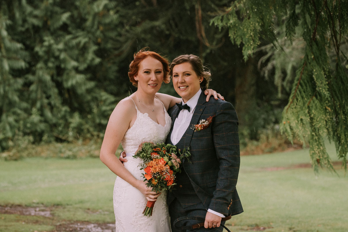 Low-budget intimate autumn Dumfriesshire country house wedding of two brides whose flowers cost just £36
