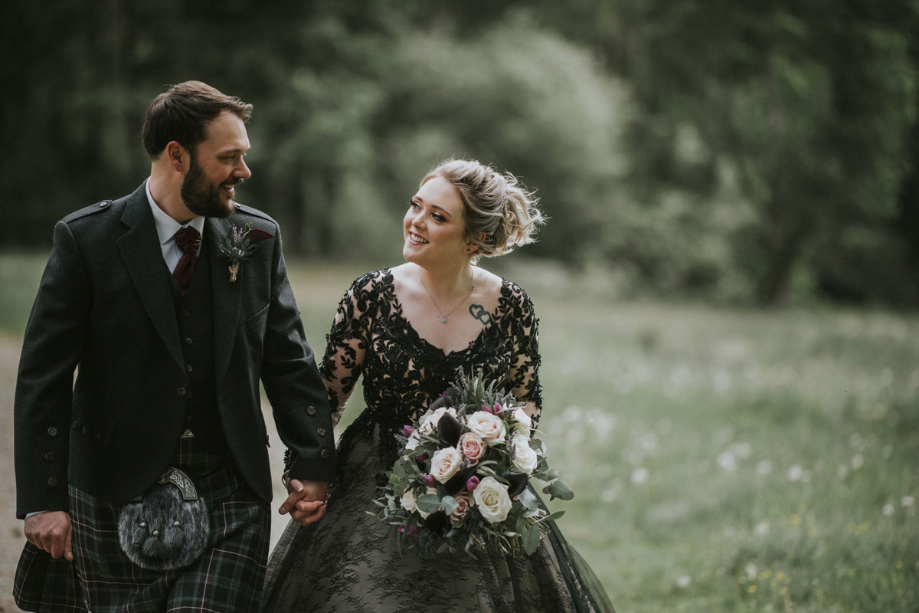 Atmospheric Highland wedding with chic vintage car and bride wearing black