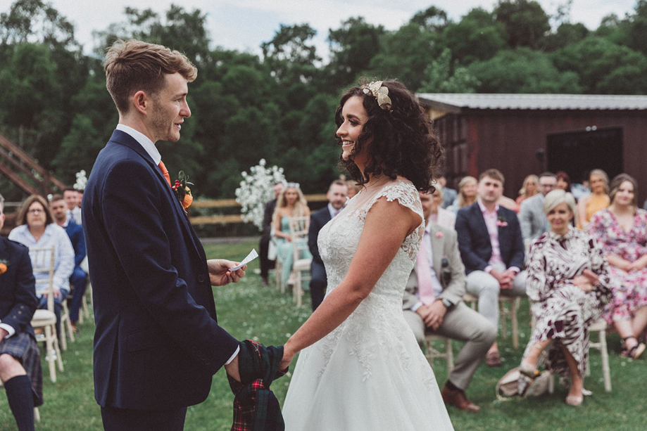 Laid-back wedding ceremony in an Edinburgh back garden with DIY decor and bride wearing lace boohoo dress