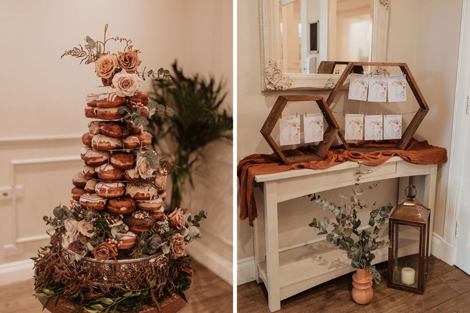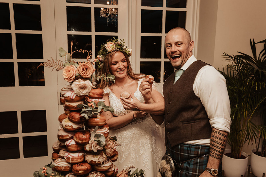 Guests pre-selected their menu, choosing from either arancini, crab cake or parsnip soup to start. Mains were chicken supreme, rack of lamb or sea bass, and a choice of either sticky toffee pudding, pear and apricot crumble or rhubarb creme brûlée. Instead of a traditional cake, we went to our favourite donut shop, Kilted Donut, and selected half a dozen that would make our wedding tower.